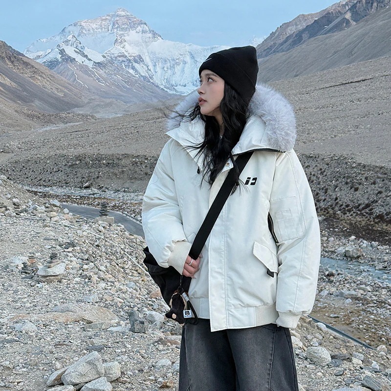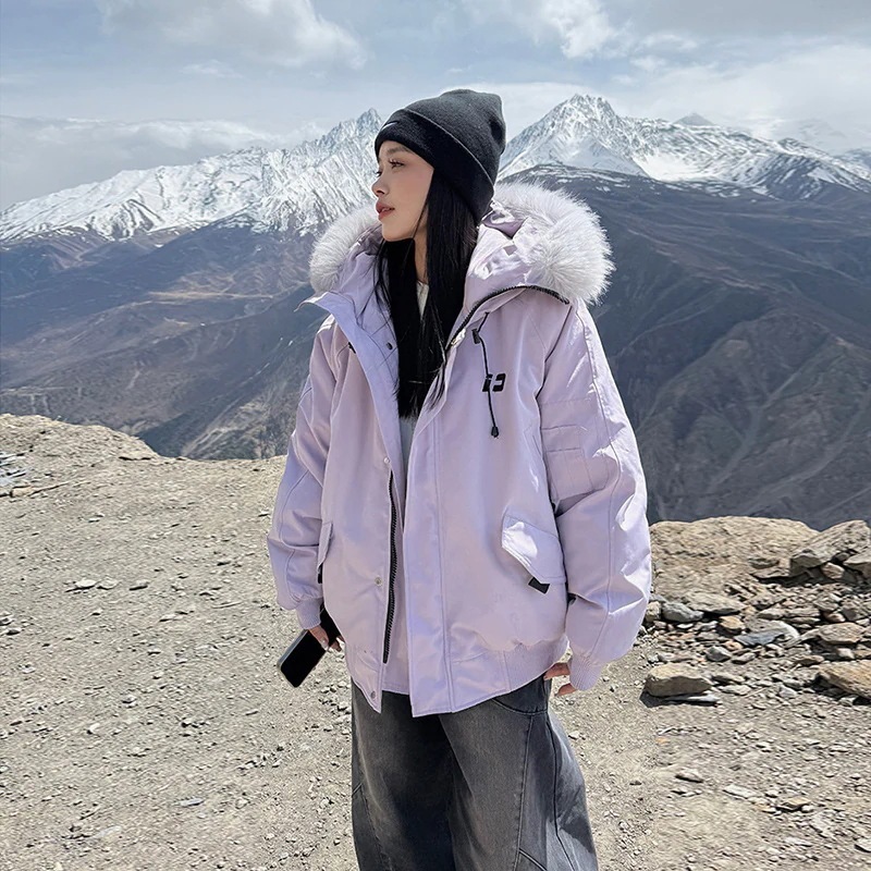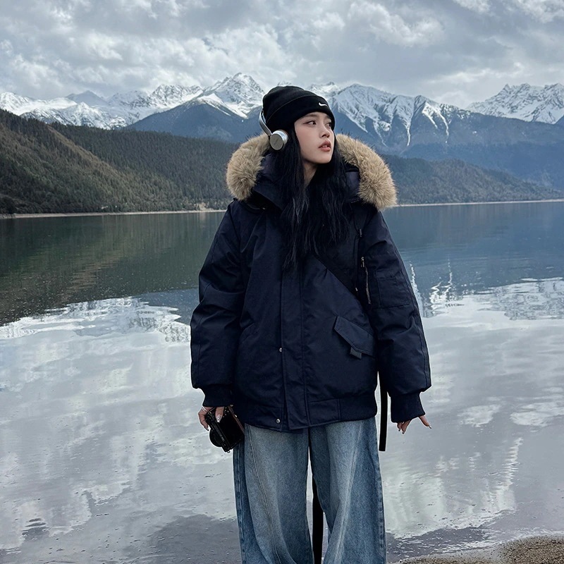 人気 フェイクファー 冬アウトドア厚手ダウンジャケットレディース アメリカンレトロパーカー大ファー付きフード付きショートダウンコート ファー 毛皮アウター