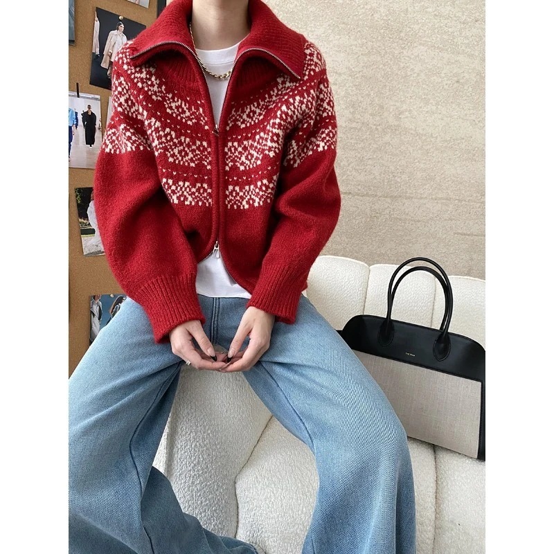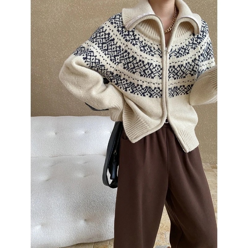 人気ニット ホリデームード レトロフェアアイル柄 2ウェイカラー ゆったりダブルジップニットセーターベーシックニット