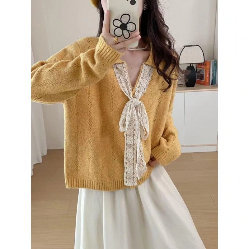 人気ニット 韓国風Vネックリボンタイ付きラペルニット 2025年秋韓国スタイル ゆるい雰囲気のニットベーシックニット