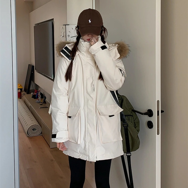 人気 フェイクファー ワークパーカーダウンジャケットレディース 冬厚手アメリカン高級感ダウンコートミディアム丈保温アウター ファー 毛皮アウター