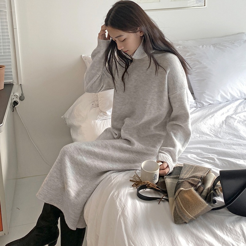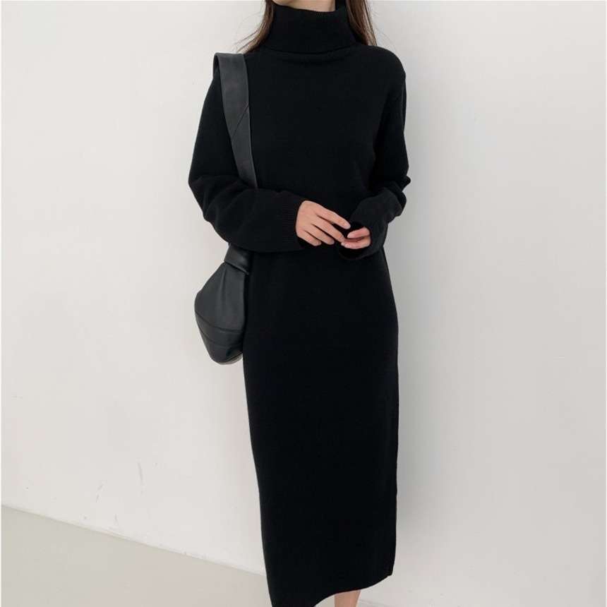 秋冬 ワンピース レディース ロング丈 膝丈以上 ニットワンピース ゆったり ハイネック インナーニット 厚手 ロングスカート
