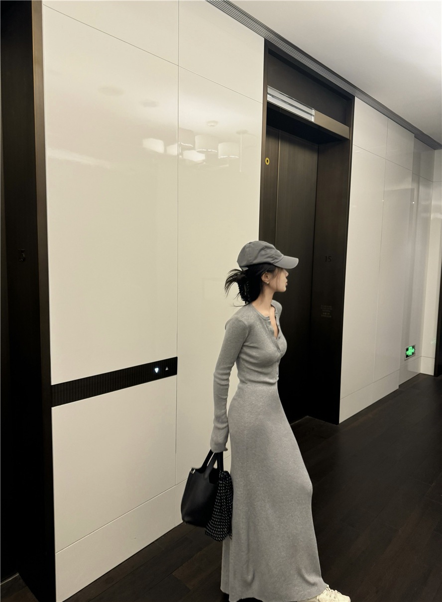 ニットワンピース 女性 秋 無地 シングルボタン 柔らかい 長袖 フィット ヒップライン強調 ロングスカート