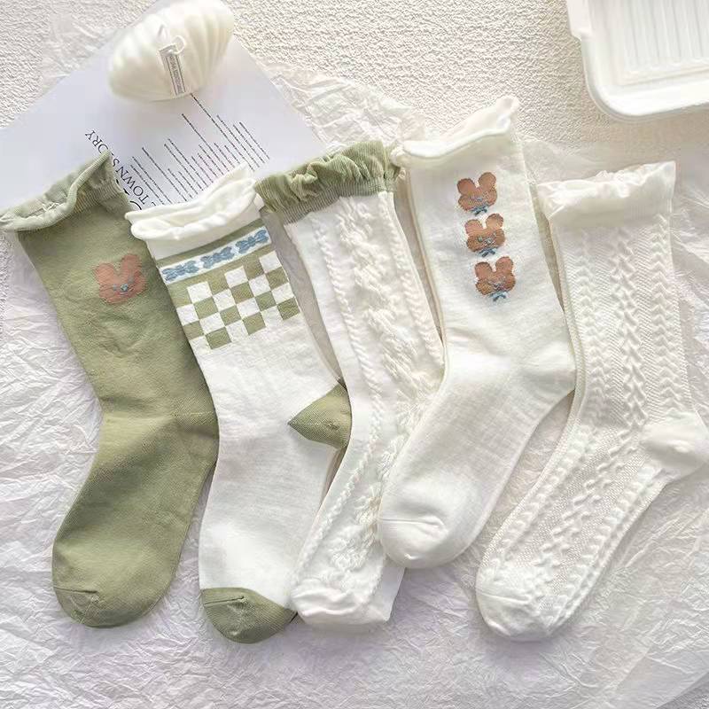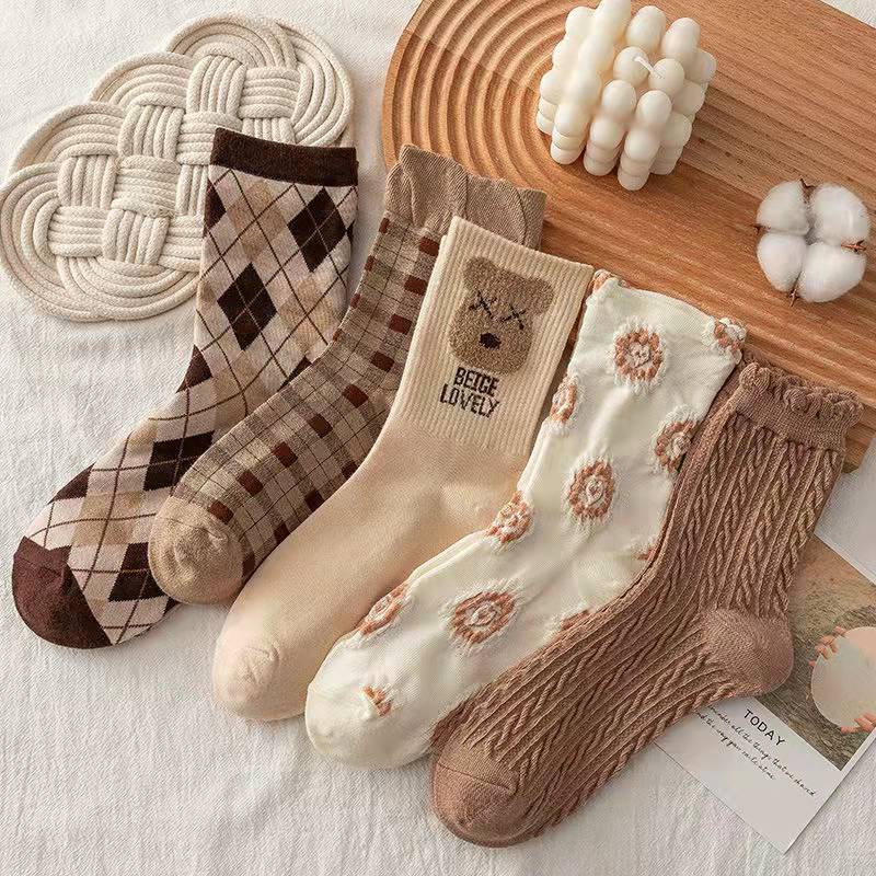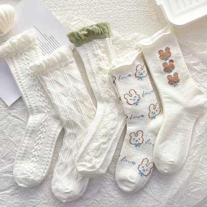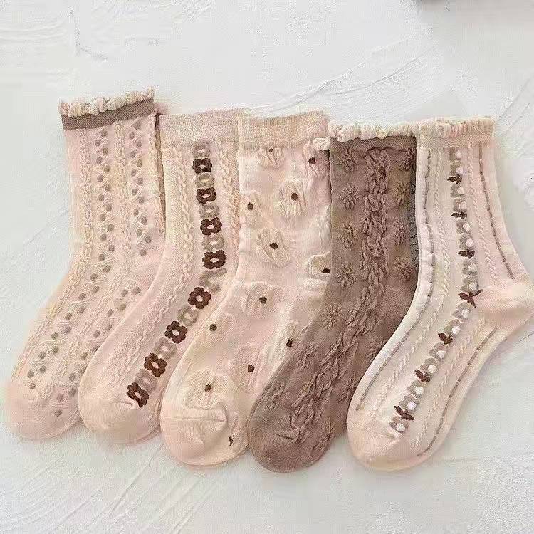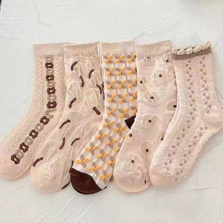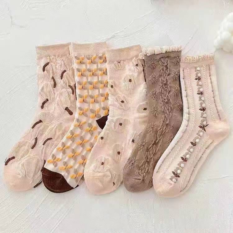 靴下 立体ジャカード 女性の韓国スタイル 漫画のパイルソックス 5ペア ハイウエストソックス