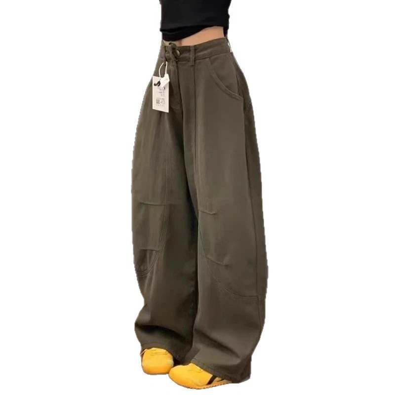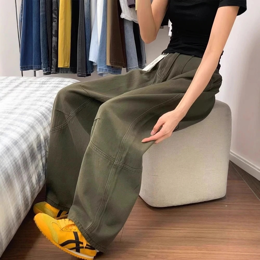 女性用 ジーンズ アーミーグリーン アメリカンスタイル ベルボトム ハイウエスト ワークパンツ ゆったり レトロルーズ ストレート カジュアル ロングパンツ