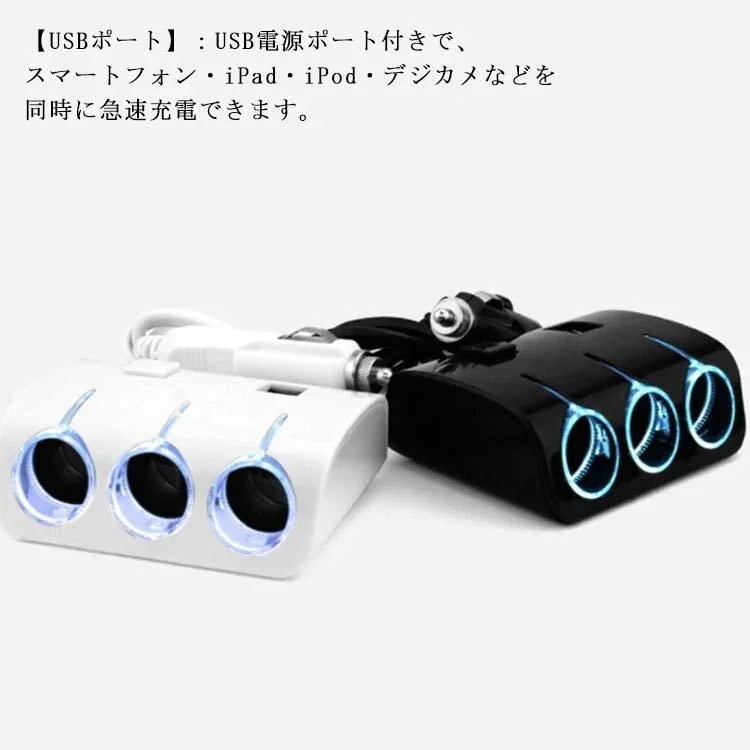 シガーソケット 3連 2USB USB 分配器 増設 スマホ スマートフォン 充電 ドライブレコーダ