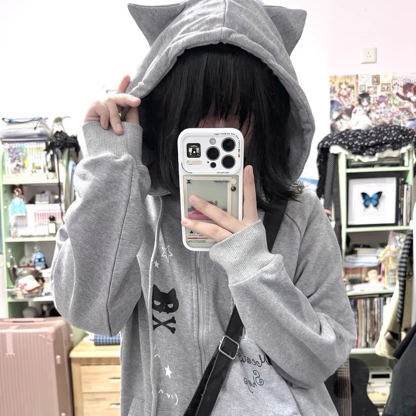 パーカー Y2Kフード付き猫耳サブカルチャー二次元長袖スウェットジップアップジャケット