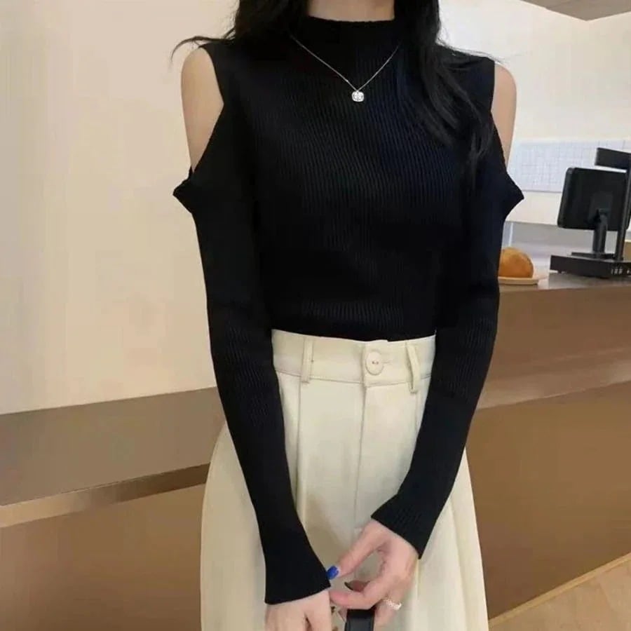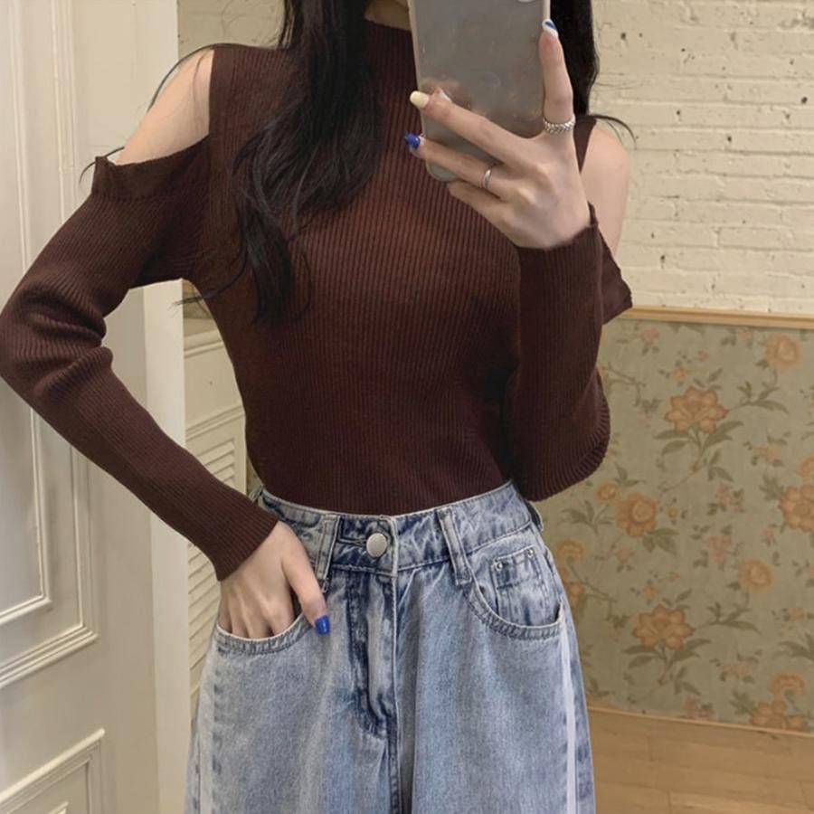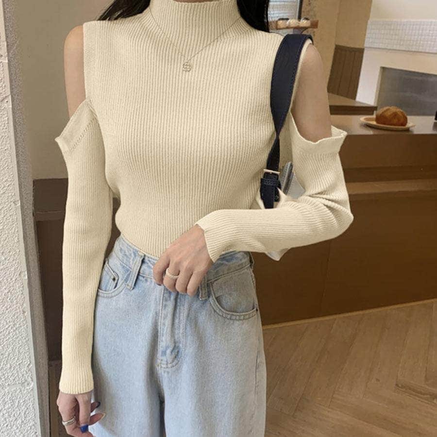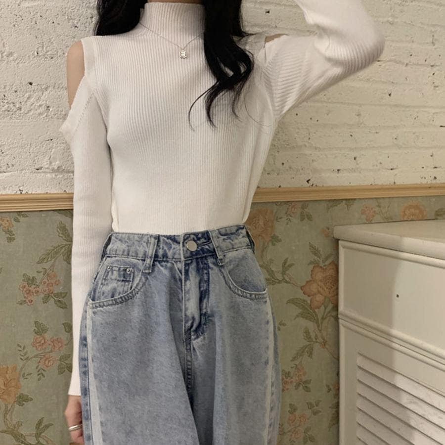 リブニットトップス 肩だし ハイネック