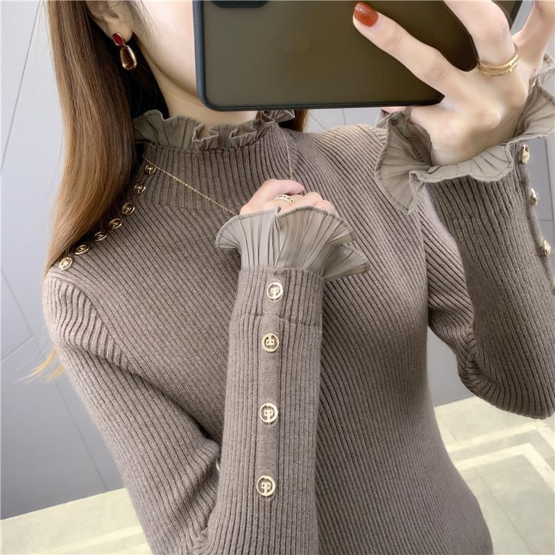 ベーシックニット タートルネックニット パッチワーク レース ニットカーディガン ハイネック 木耳縁 セーター 着痩せ インナー