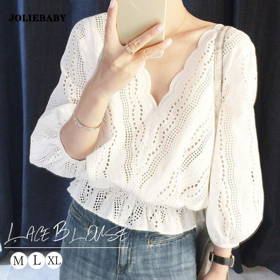 スカラップ レースブラウス レディース Vネックシャツ パフスリーブ ウエストゴム レーストップス 七分袖 シャツブラウス