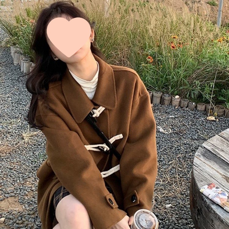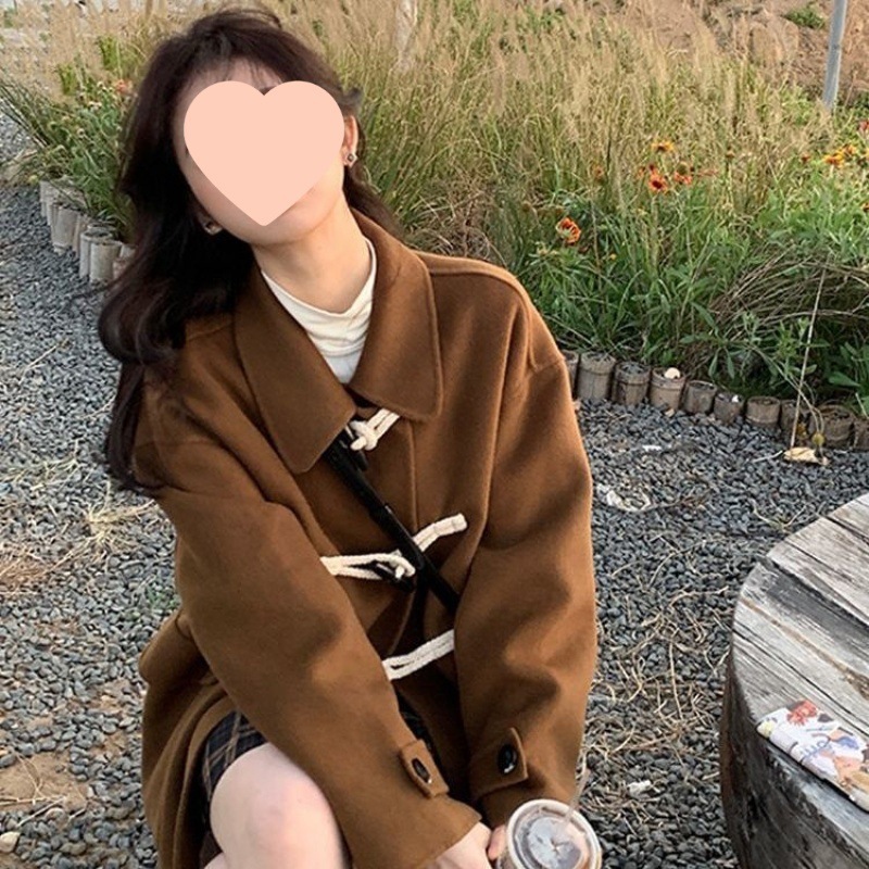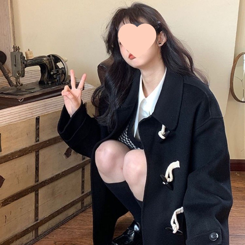 小柄アカデミア風黒レトロファーコート女冬ショート丈厚手牛角ボタンラシャコートゆったり