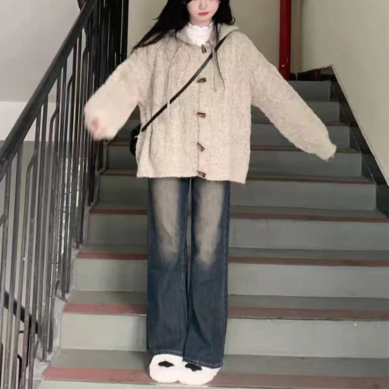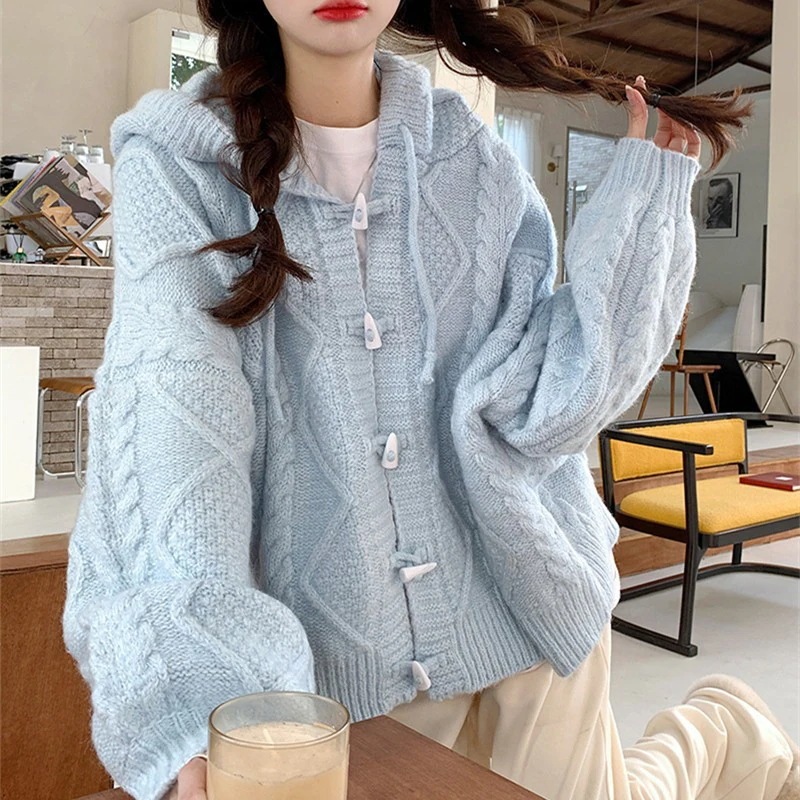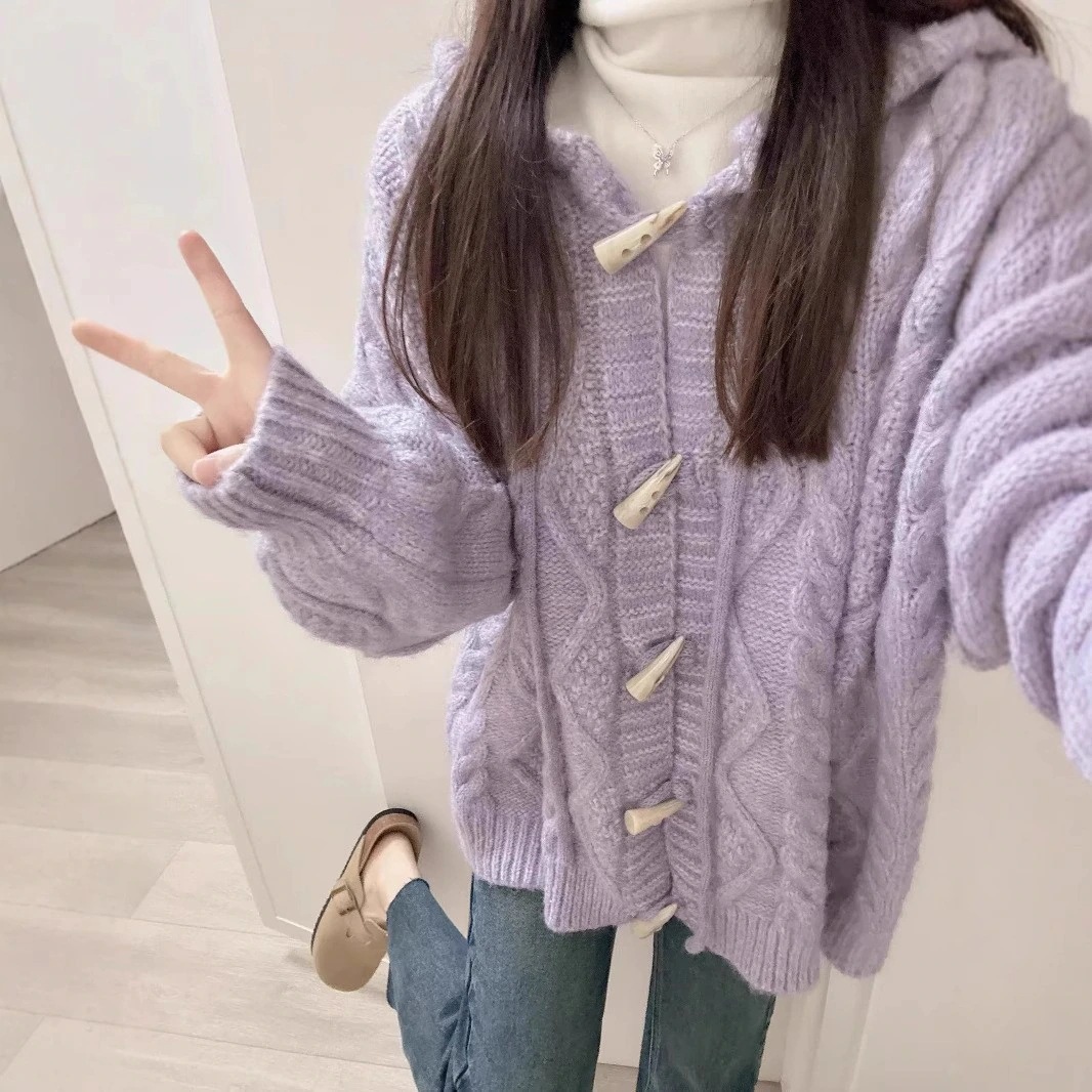 秋冬 デザイン性 小柄 ふんわり フード付き ニットカーディガン ゆるいスタイル 厚手 角ボタン セーター アウター