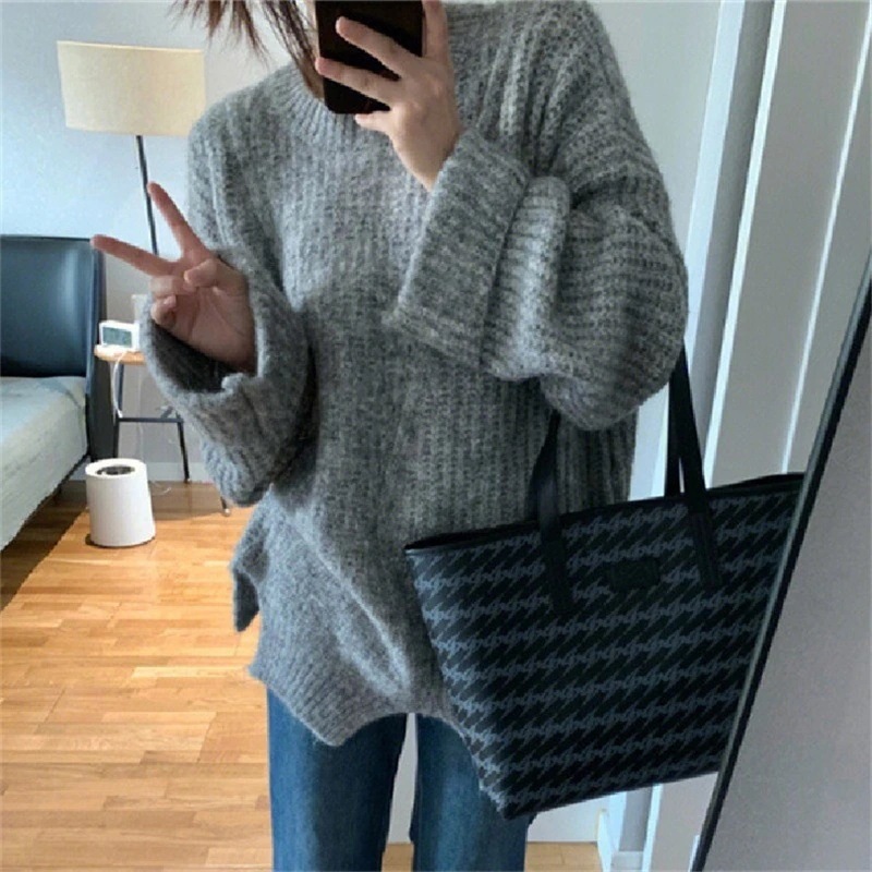 人気なリブニットグレーの厚手セーター カシミヤタッチ 秋の新作 けだるさジャケットデザイン感 ベーシックニット