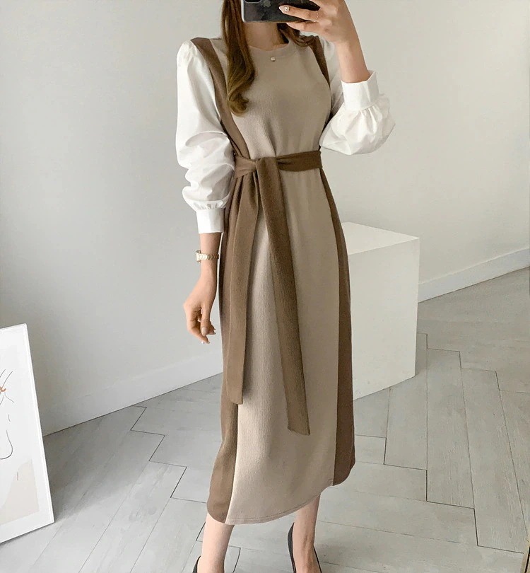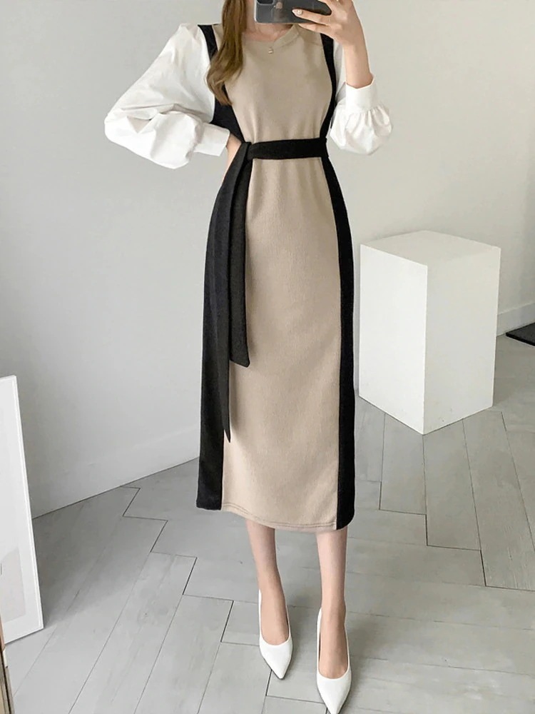 韓国春秋冬レトロな色合わせニットワンピースのつなぎ目ベルト痩せ見えバブルスリーブ長袖A字ミディアムスカートドレス