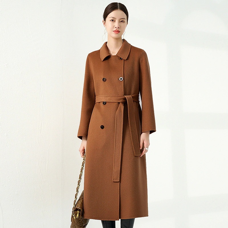 100%ピュアカシミヤ両面ウォーターリップルコートレディースロング秋冬新作ダブルローオックスホーンウールコート