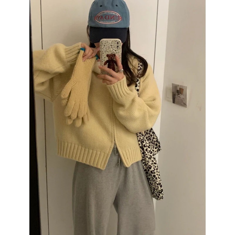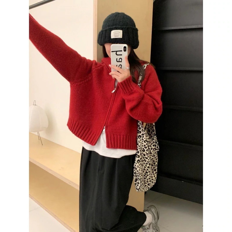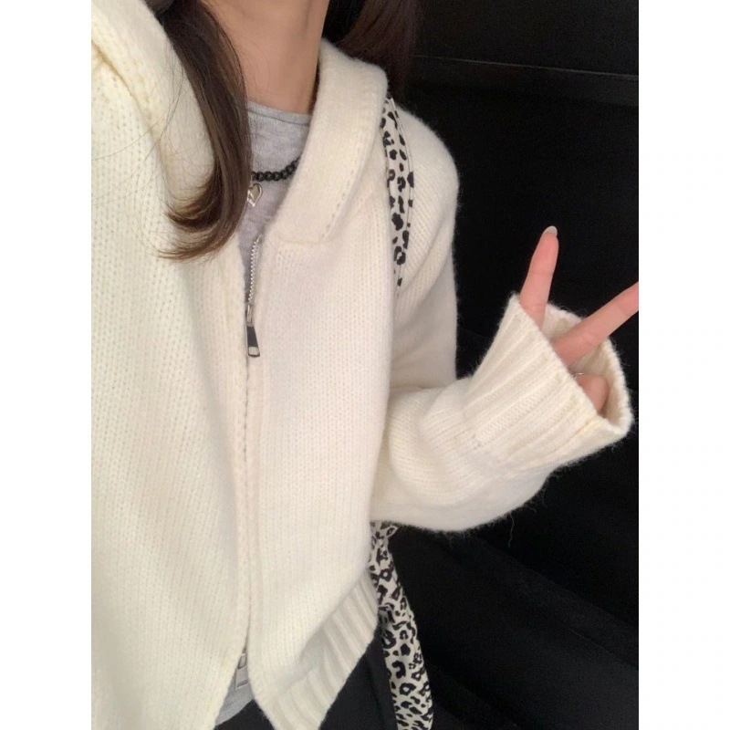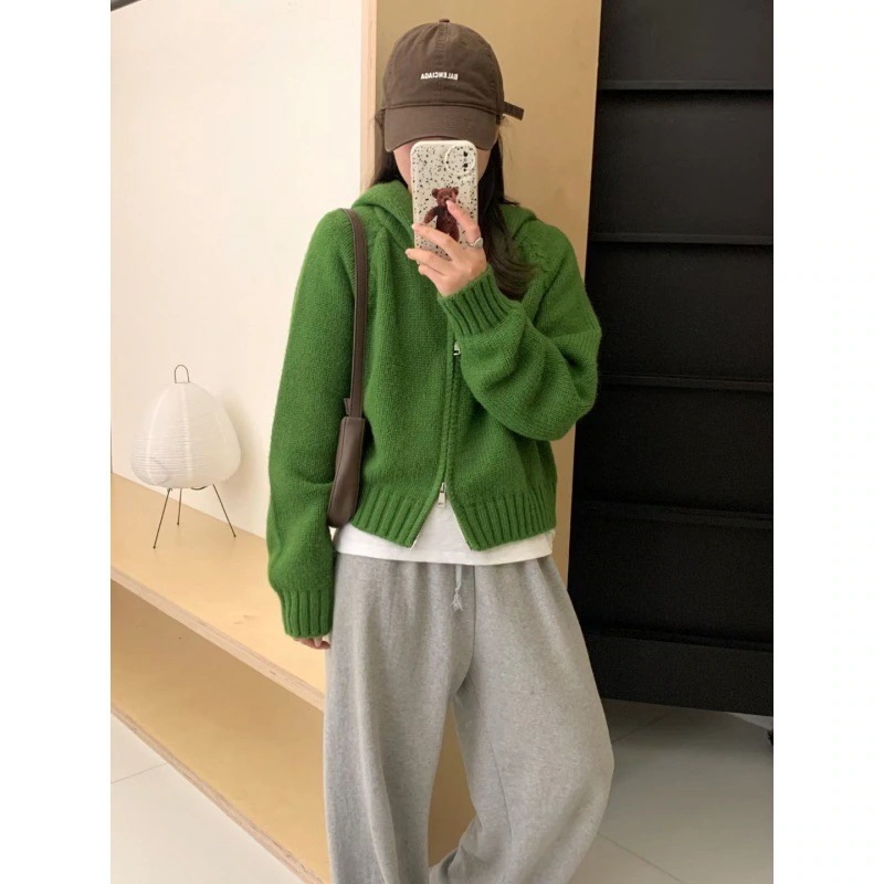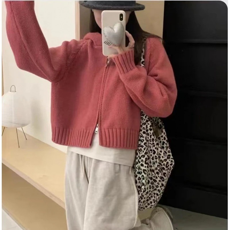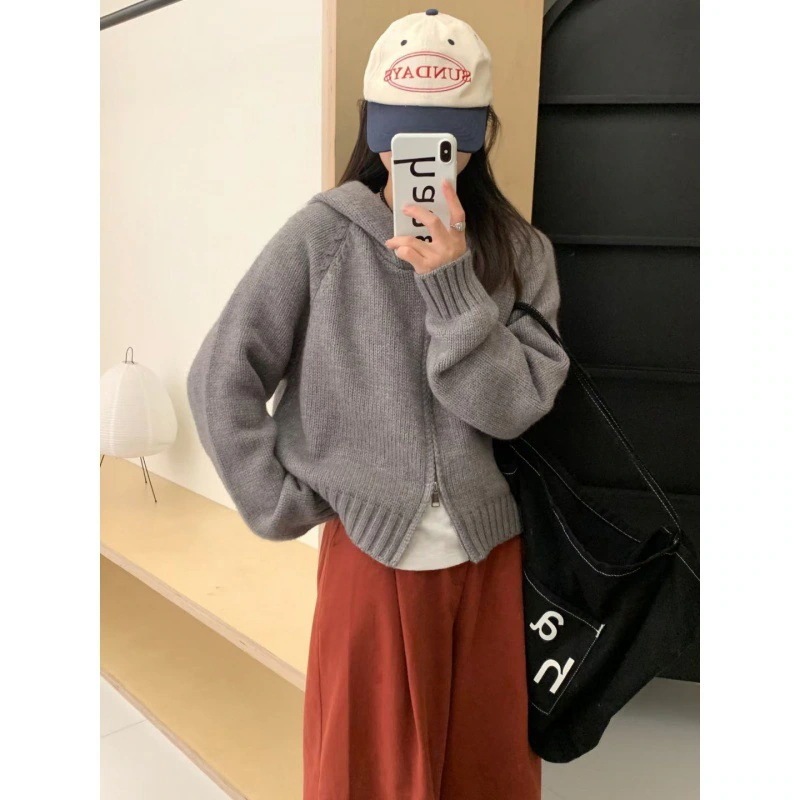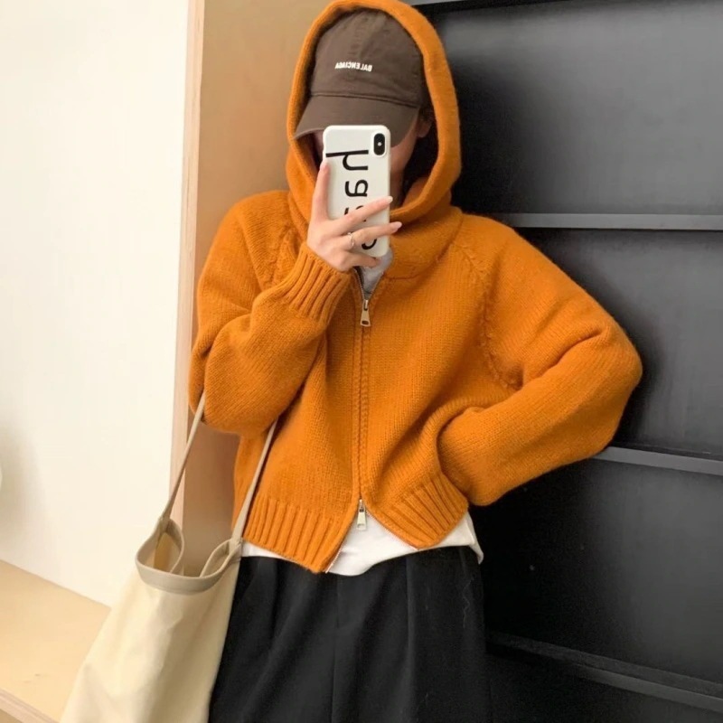 2025 カーディガン フード付きジッパーセーターコート ショート丈ニットカーディガン
