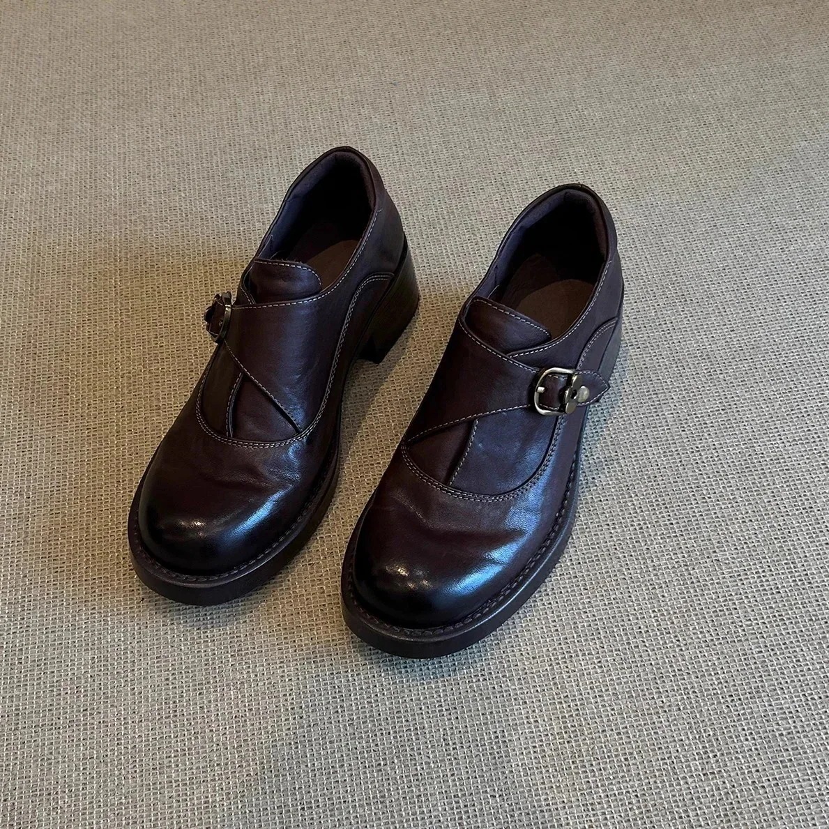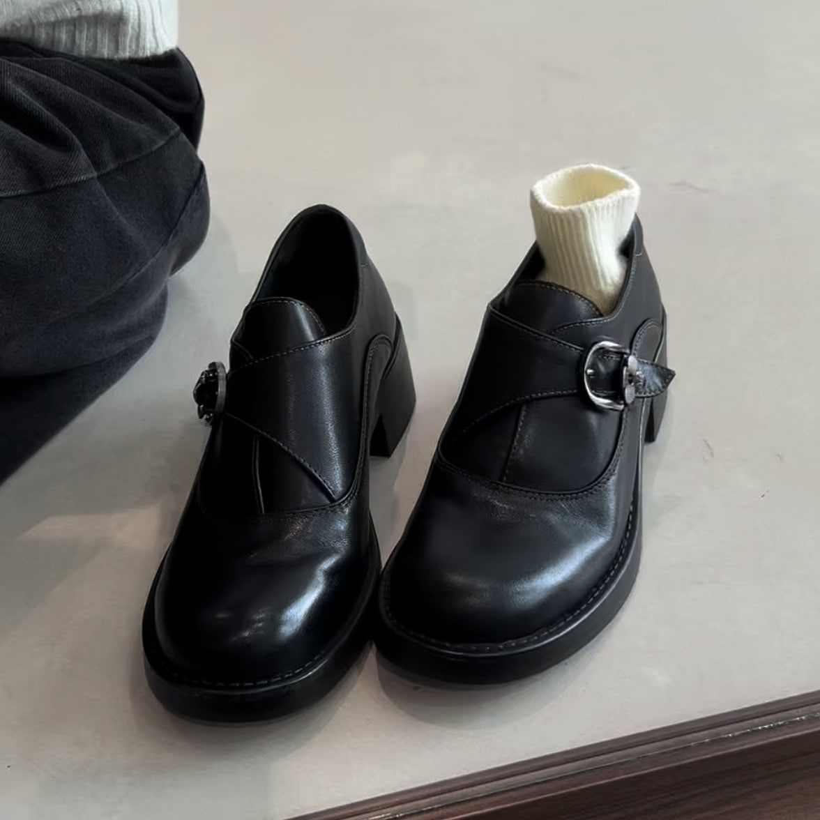 【3日出荷】イギリス風ローファー 厚底ベルトバックルローカットシューズ レディース太ヒールモデル