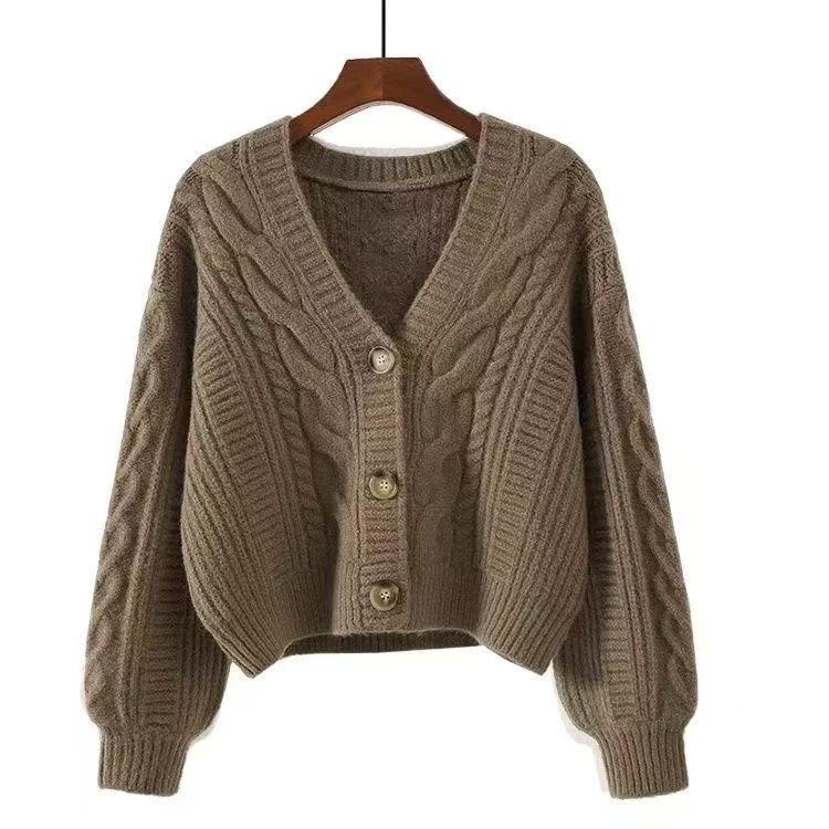 新作レトロVネックニットカーディガンセーター ショートセーター小柄な方秋冬ゆったりアウタートップス