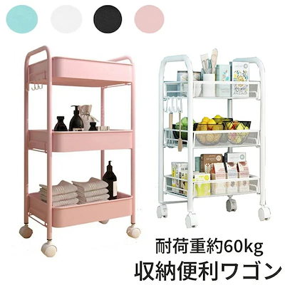 キッチンワゴン キャスター付き 3段 カート メッシュ キッチン バスケット 台所 かご スチール ラック メタル シェルフ 棚 すき間 小物 収納 ホワイト ブラックグリーンー ピンク