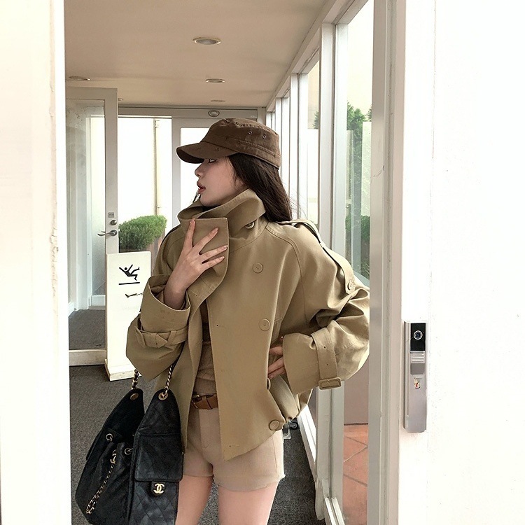 カーキ スタンドカラー ショート丈 トレンチコート レディース 2025年新作 秋 小柄 高級感 ダブルボタン ブリティッシュスタイル アウター