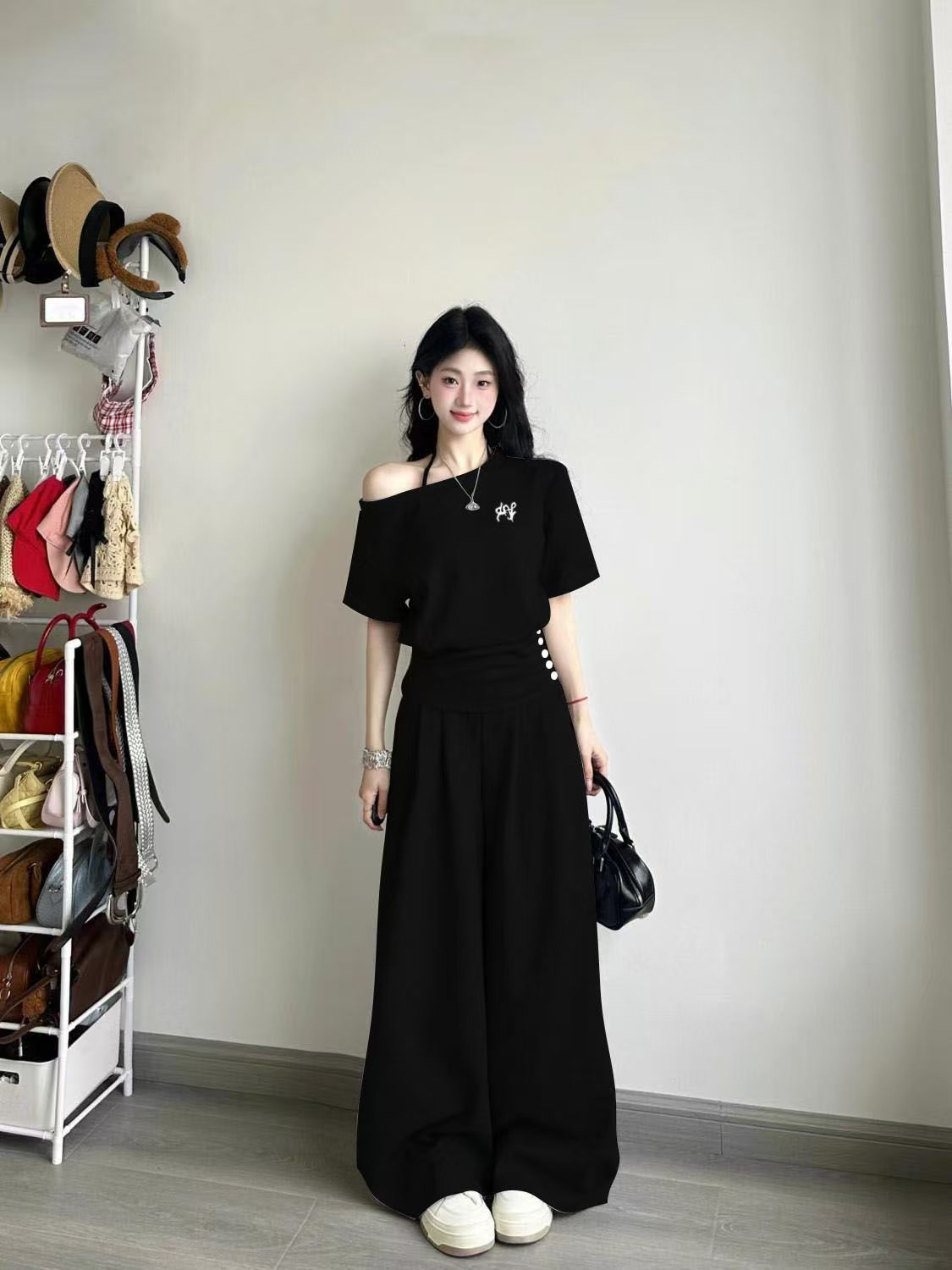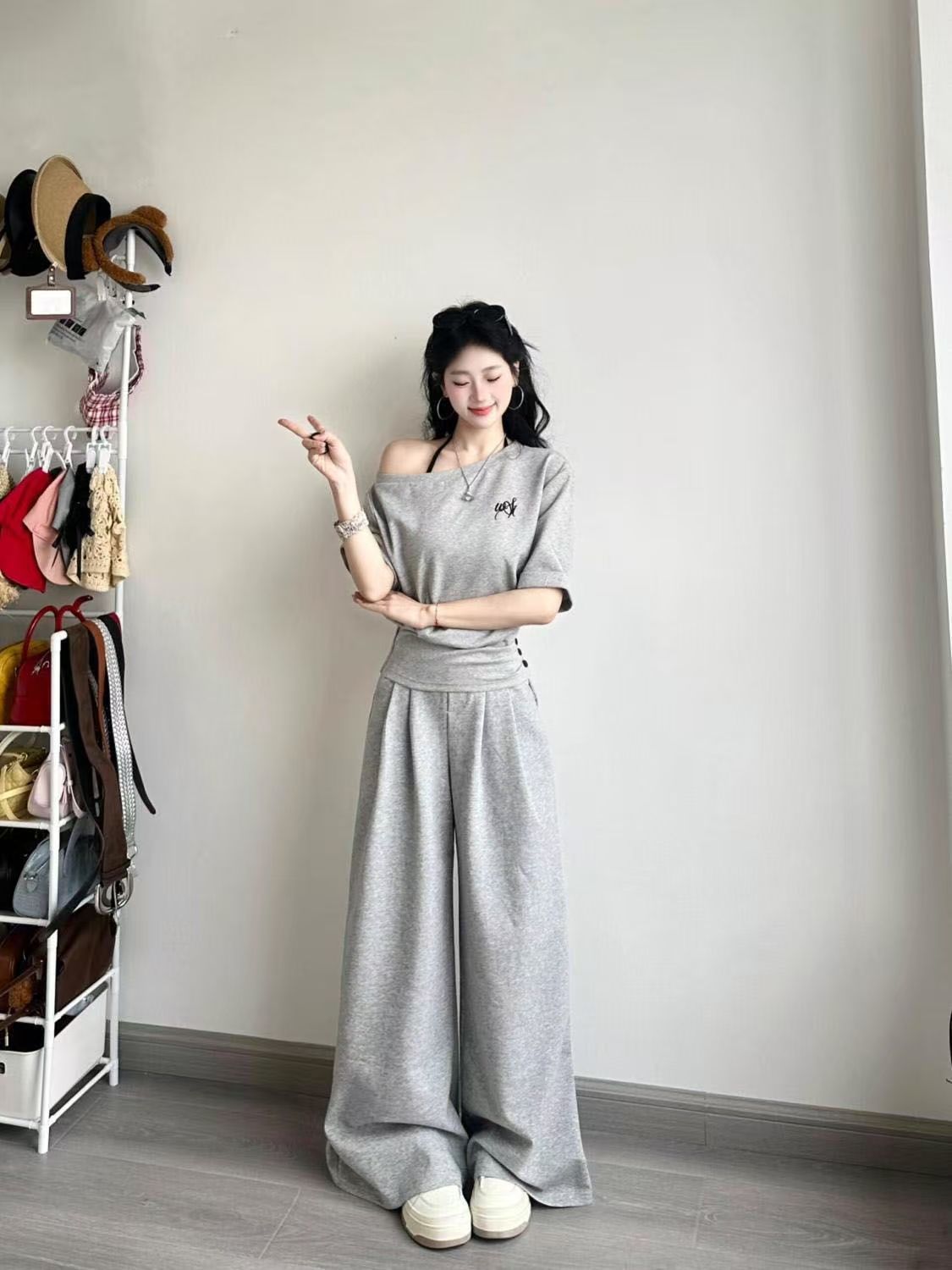 秋ファッション スウェット セットアップ 2点セット 半袖tシャツ/ロングパンツ 無地 ワンショルダー ウエスト引き締め 体型カバー 通気性 レディース