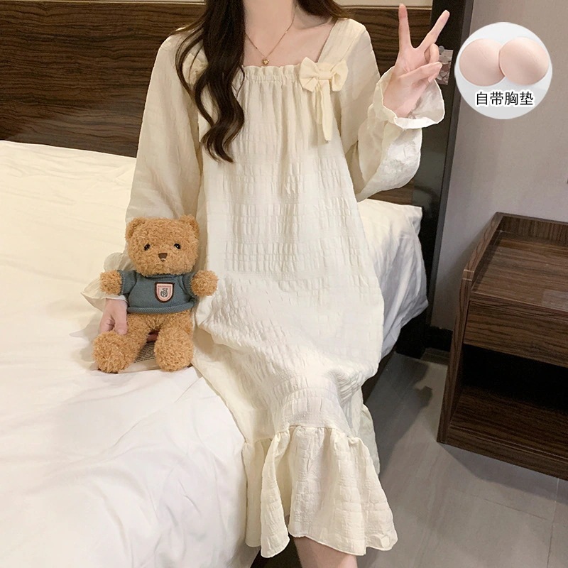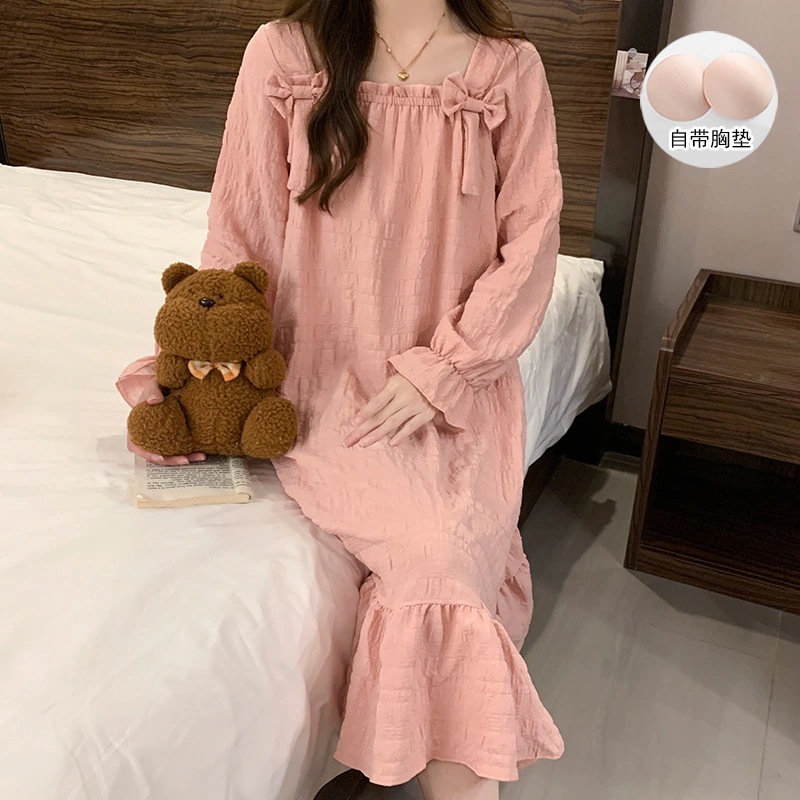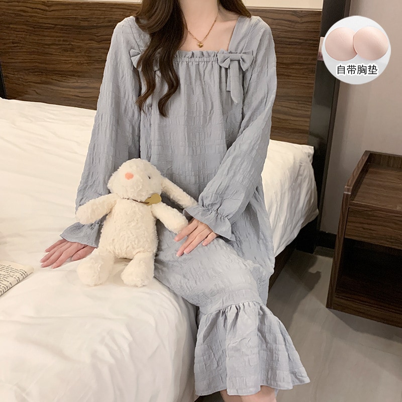 夏 パジャマ 長袖ワンピース カップ付き 長袖 スクエアネック 無地 ゆったり ロング丈 カジュアル ルームウェア 部屋着 レディース