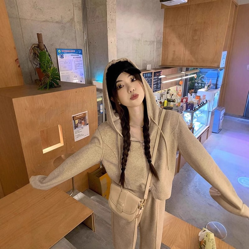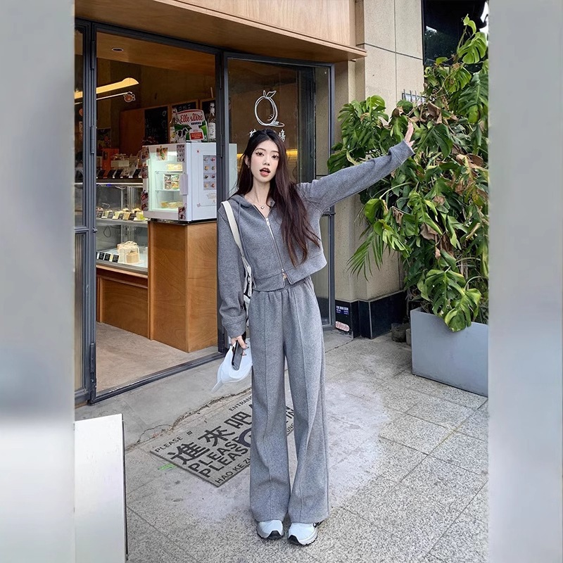 レディース春秋用カジュアルスポーツセット 新作ゆったり韓国風フード付きジップアップスウェット&ワイドパンツ2点セットおしゃれコーデ