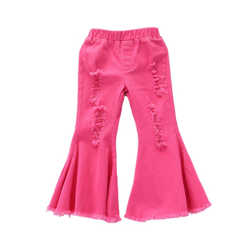 ガールズデニムフレアパンツ無地破れパンツタイトストレッチ子供パンツno