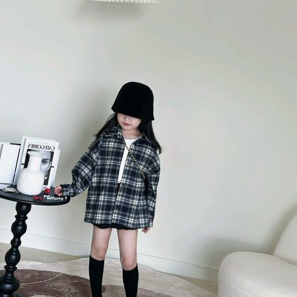 ガールズレトロブルーとブラックのチェック柄コートシャツ子供用長袖カーディガンガールズシャツ