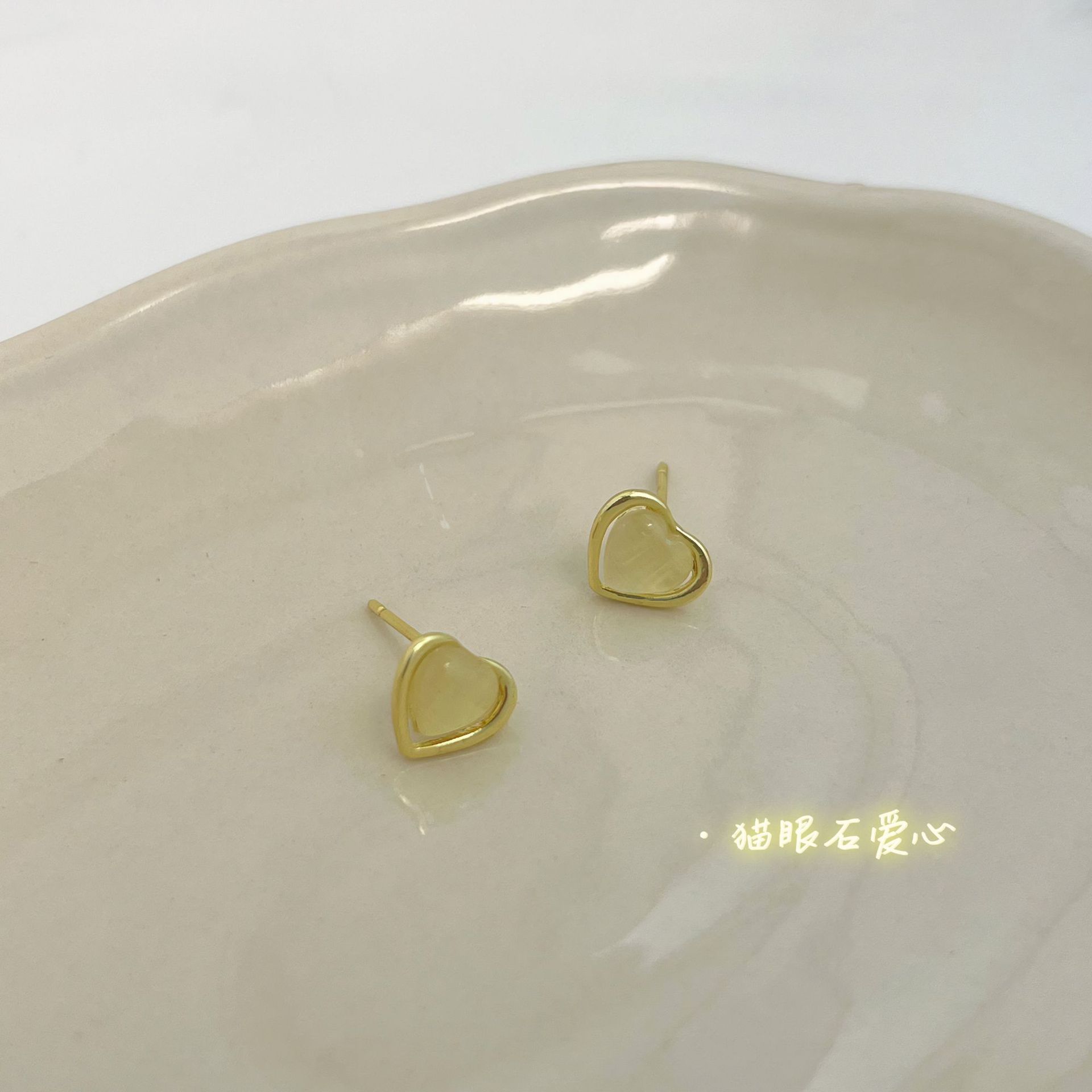 中空ハートキャッツアイストーンイヤリング女性用S925シルバー甘い気質の万能イヤリング高度なニッチデザインイヤリング