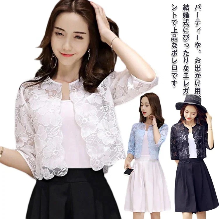 七分袖ボレロフォーマル華やか結婚式夏きれいめカーディガンジャケットパーティーボレロレディース夏薄パーティーカジュアルUVケアノーカラーショート丈羽織りレース