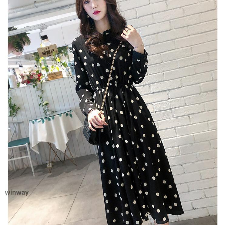 ワンピース ロングワンピース レディース 春 秋 ドット柄 マキシワンピース 大人気 上品 長袖 Aラインワンピ カジュアル きれいめ Vネック