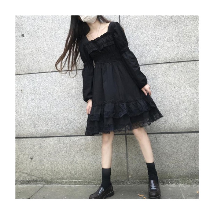 春のワンピースレース黒ドレス女性春長袖スクエアネック小さなショートドレス