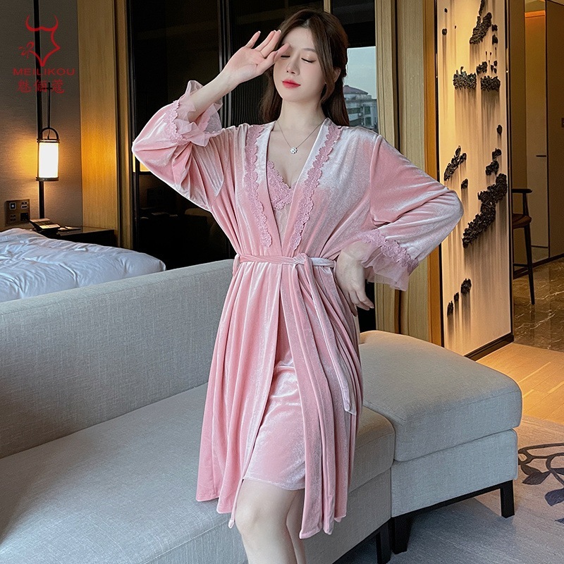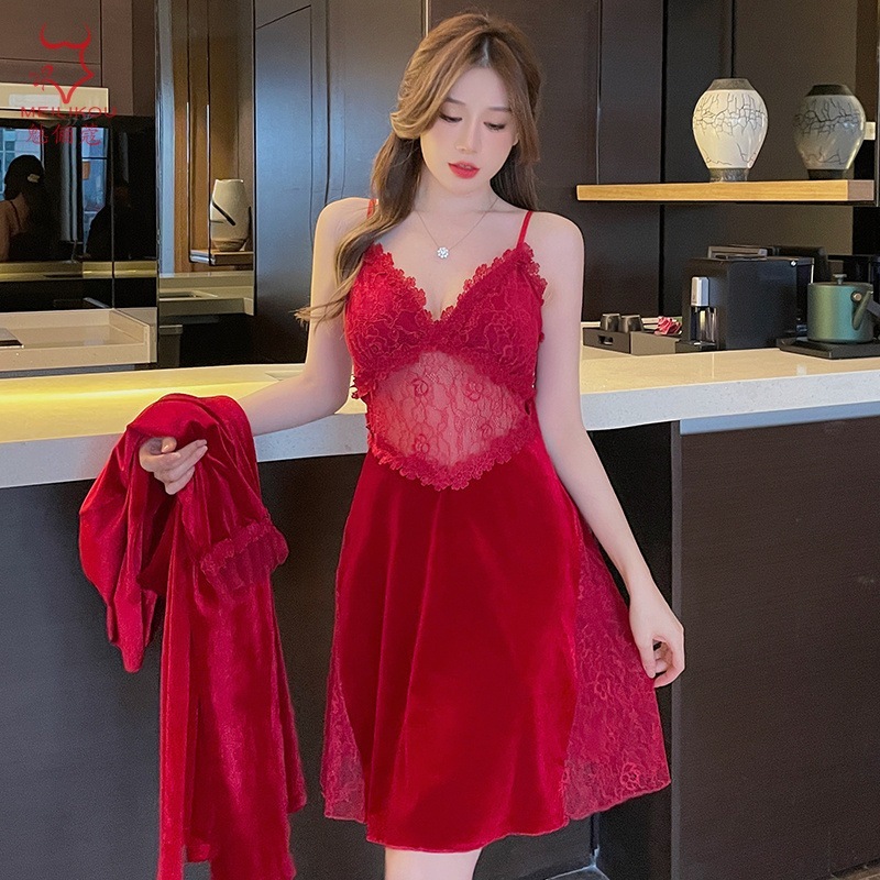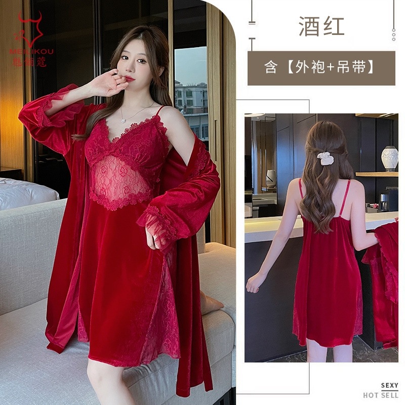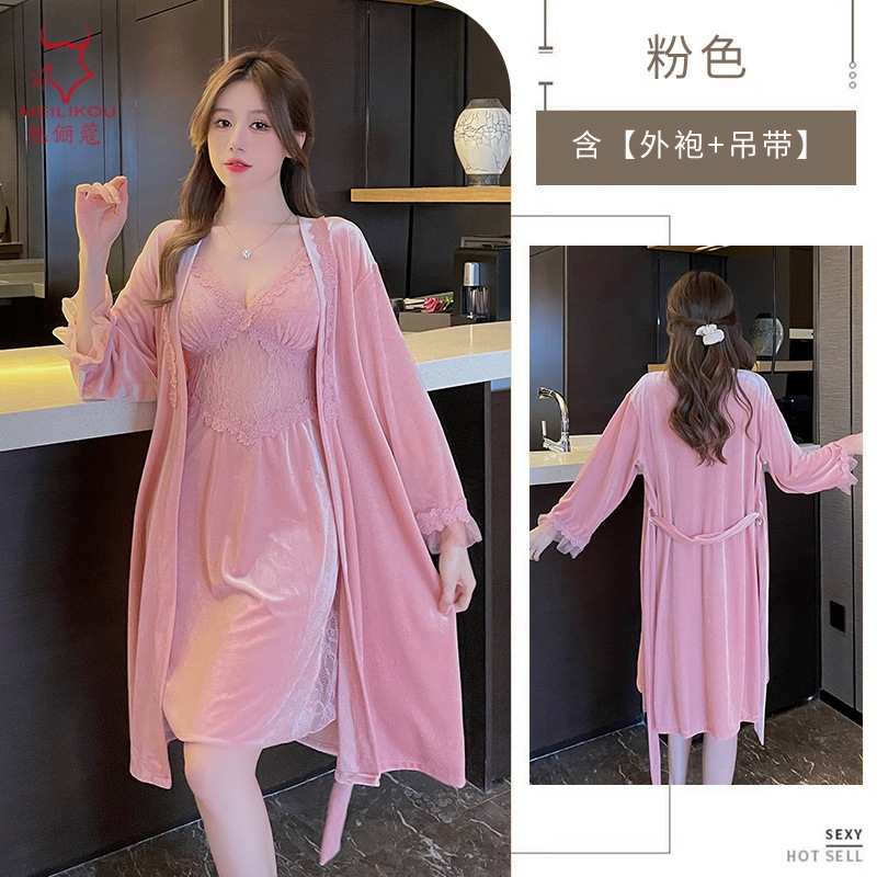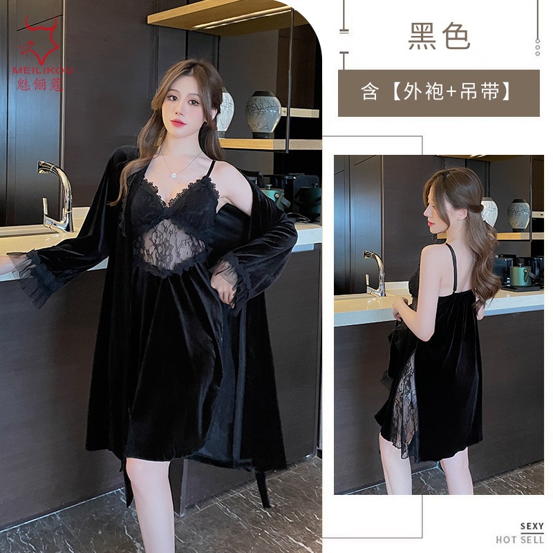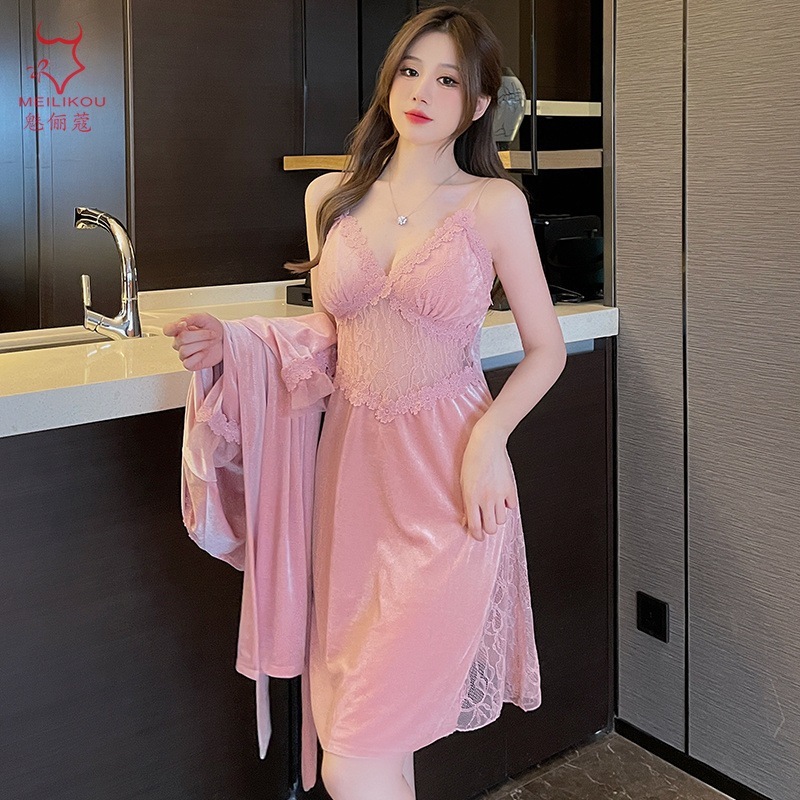 レースベッドルームロングドレス 女性用秋冬在宅純欲スリップドレス 大きめサイズ ラッセンドレス 1908