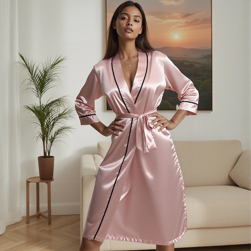 高級シルクのセクシーなロング丈春夏季女性用バスローブ 長袖 高級感あるパジャマ 人気家居服