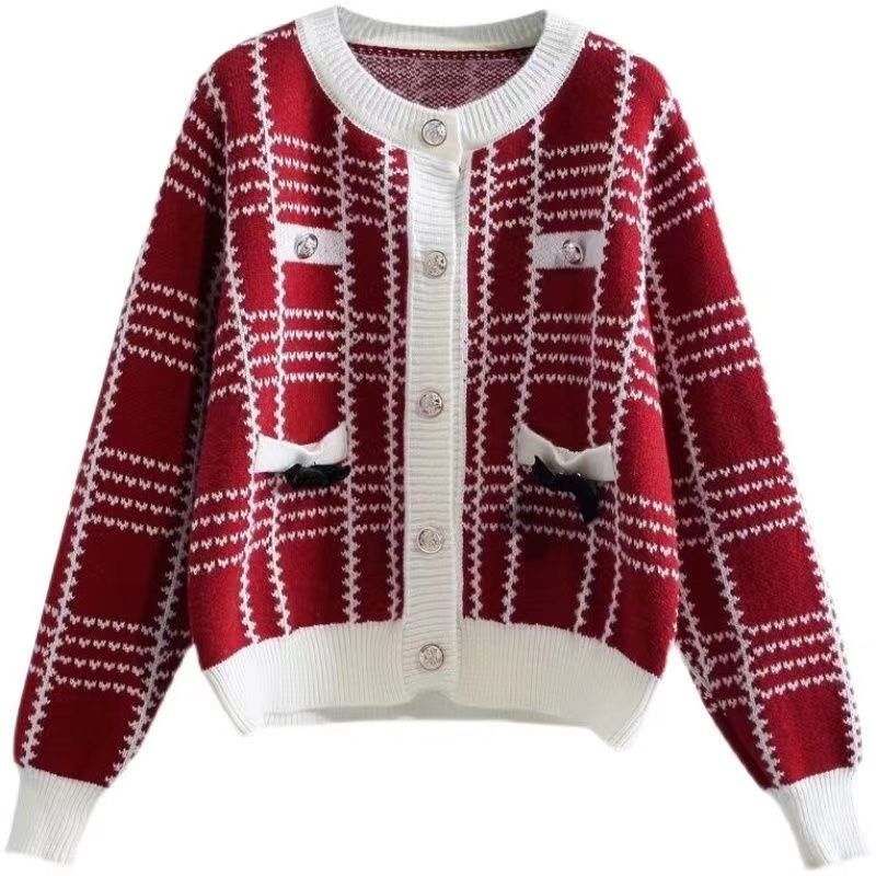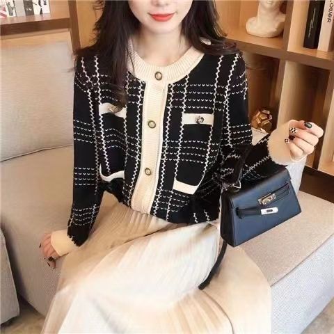 小香風新ラウンドネックチェックニットカーディガン女性長袖セーター トレンチコート