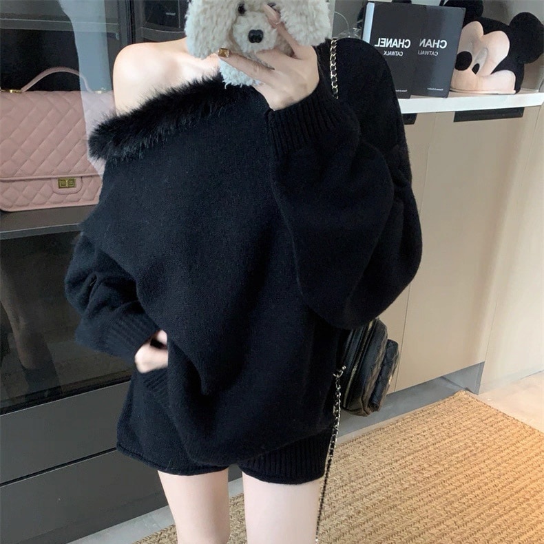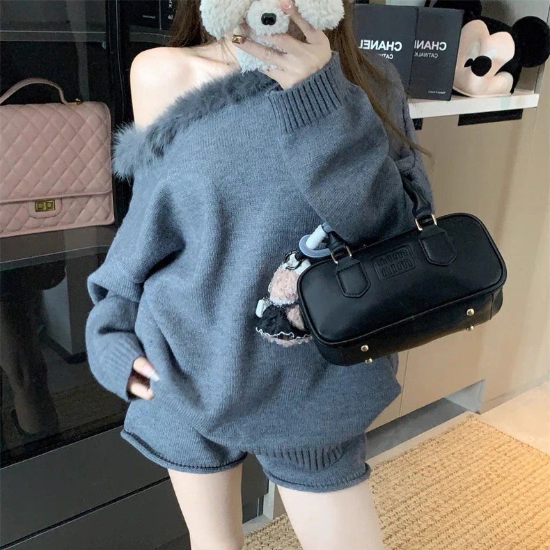 ファー付きオフショルダーセーター秋冬用ミドル丈インナーゆったりニットトップス&ショートパンツ2点セット