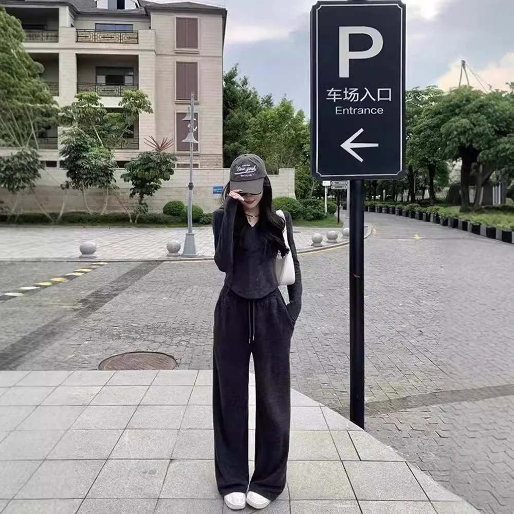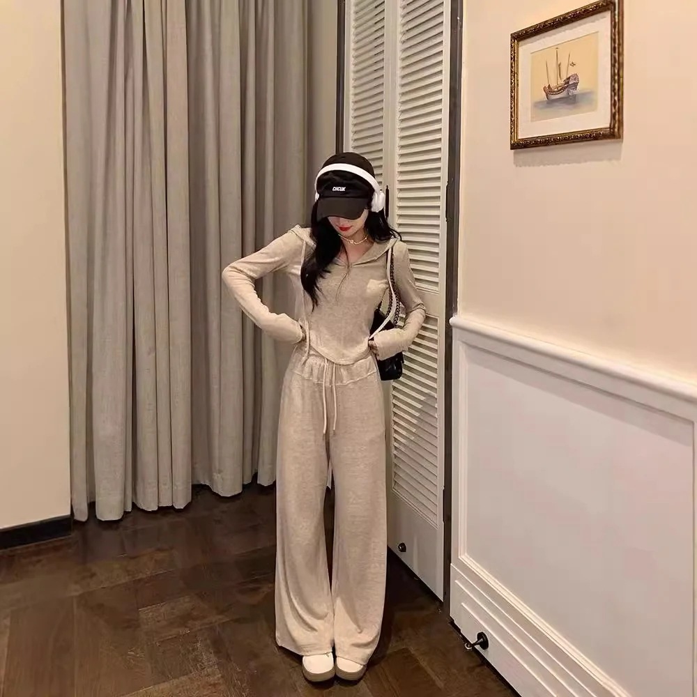 スリム若返りおしゃれカジュアルセット レディース春秋フーディシルエットトップスワイドパンツゆったりスポーツウェア2点セット