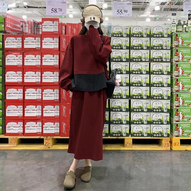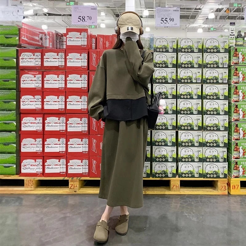ぽっちゃり女性向けグリーンフーディースカートファッションセット女性秋おしゃれ韓国風カジュアルスリムツーピース