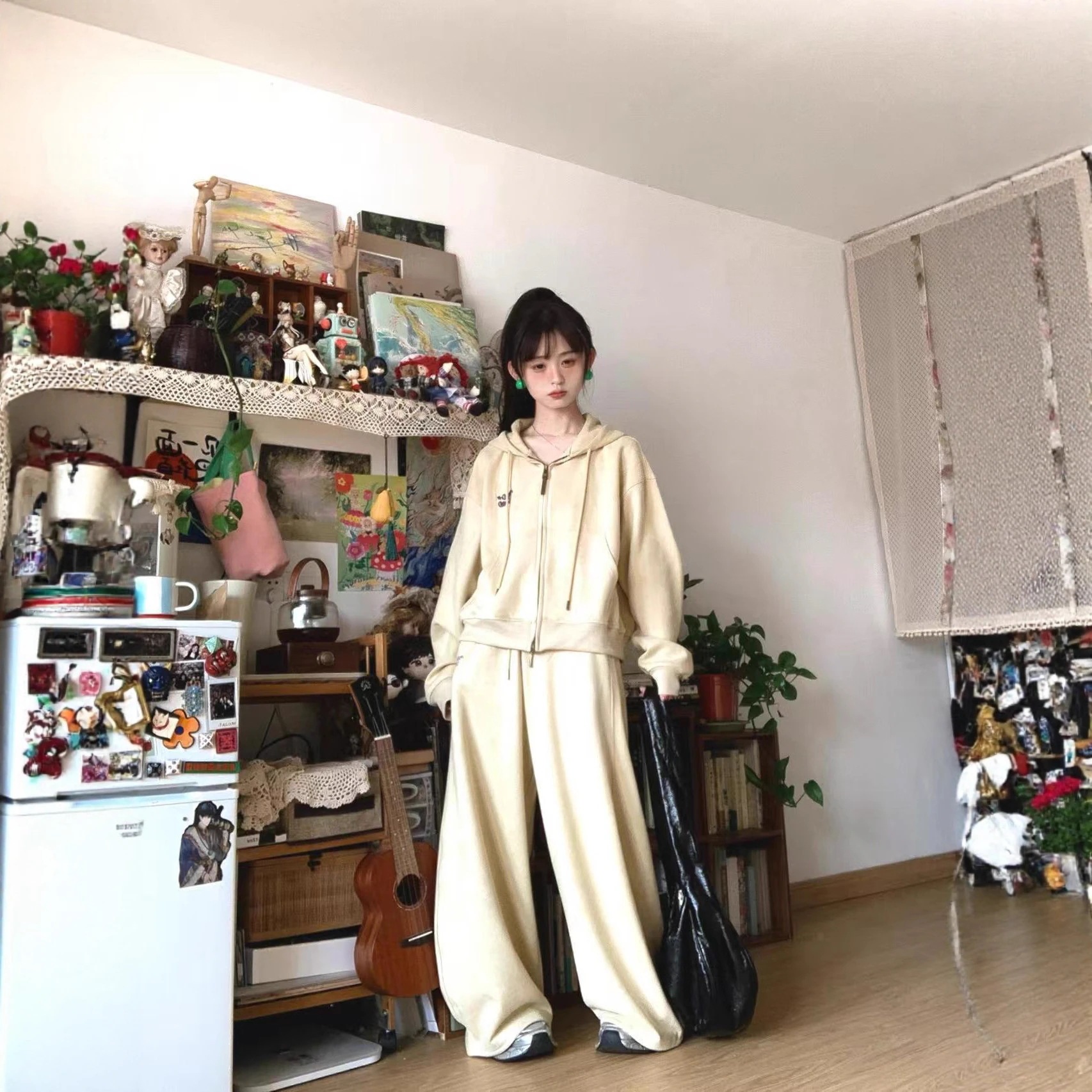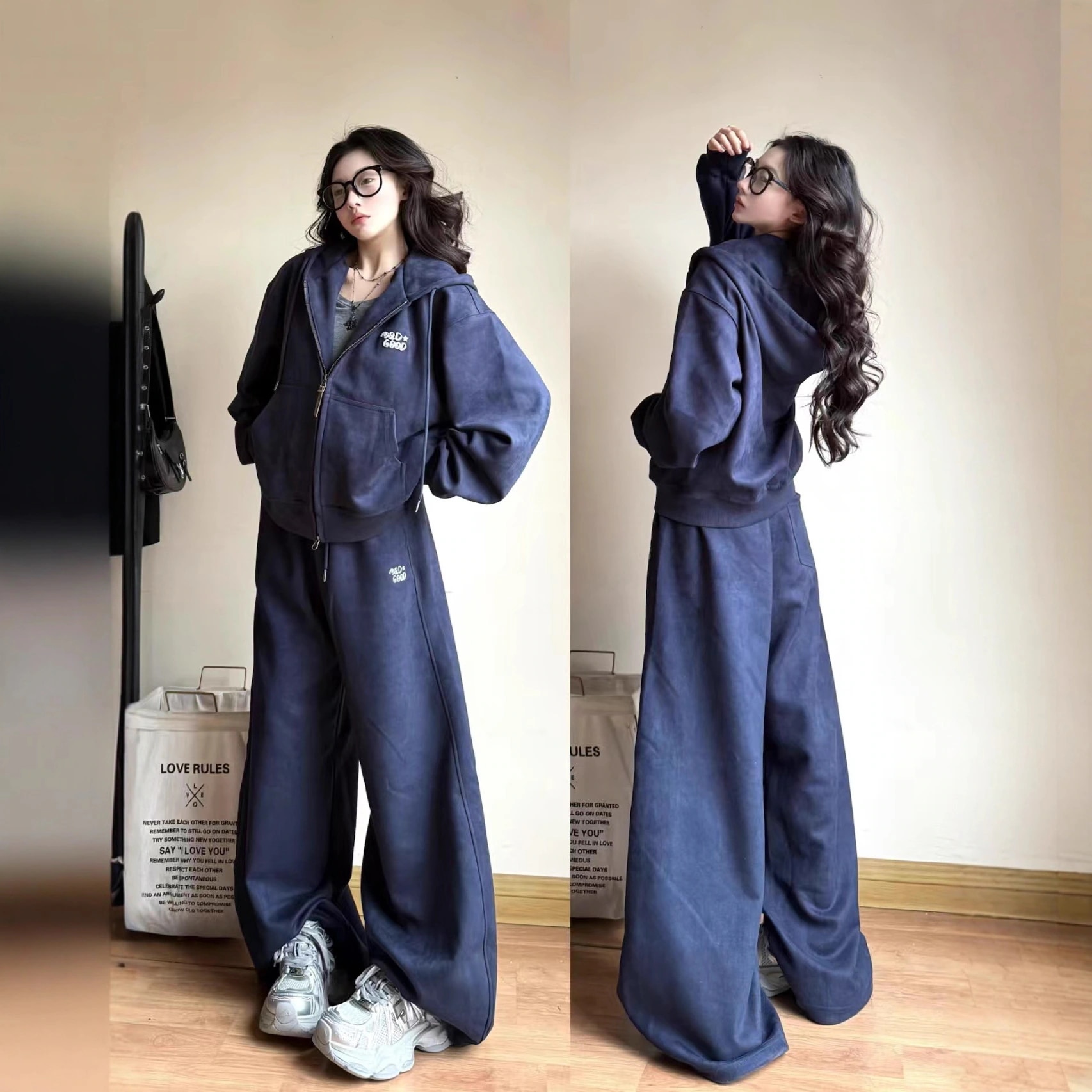 秋冬高級感カジュアルファッションスポーツセット 女子学生 ゆるい風カーディガンパーカー ワイドパンツ2点セット