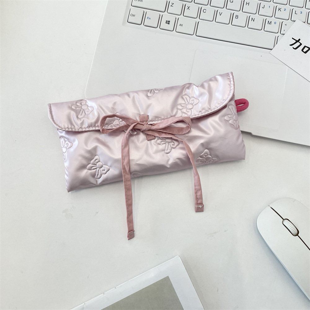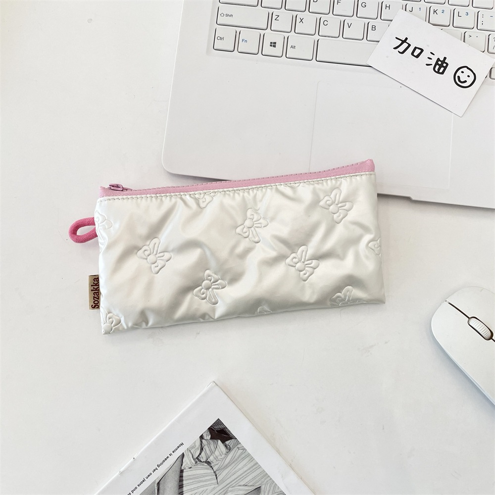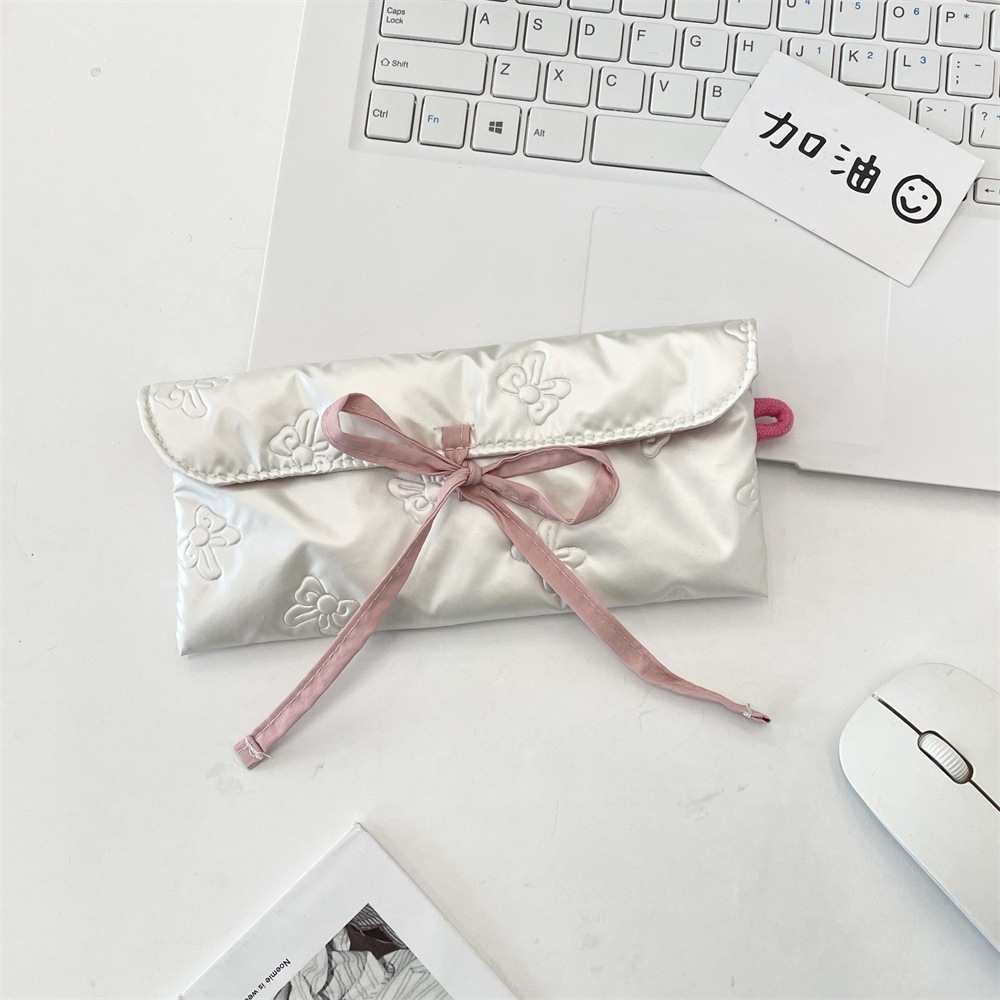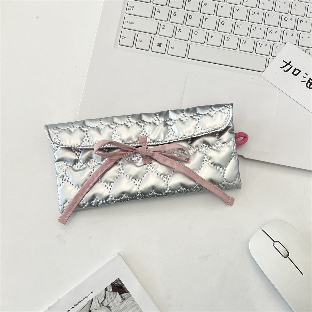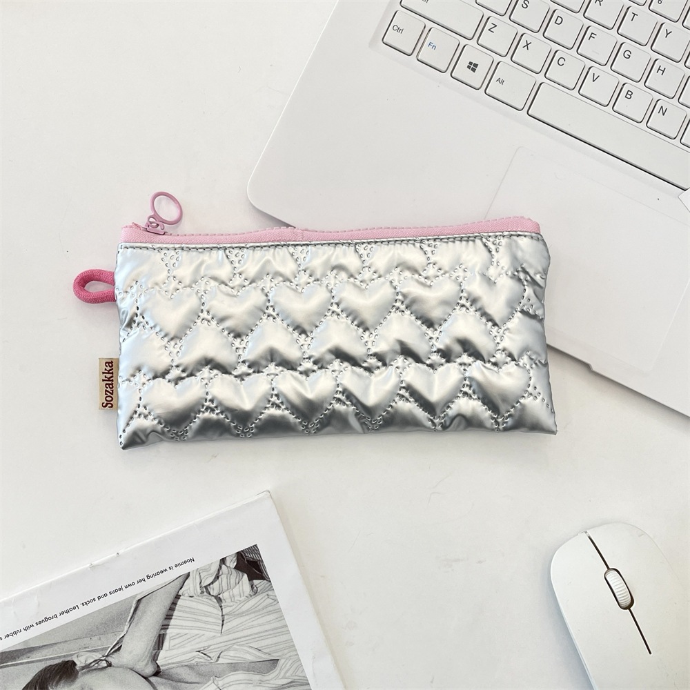 韓国系 多機能ペンケース リボンハートキルトが可愛い両開きポーチ 小物や文房具をすっきり収納 ベージュシルバーピンクの3色 おしゃれなマチ付き収納袋