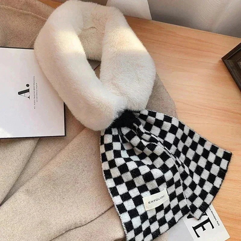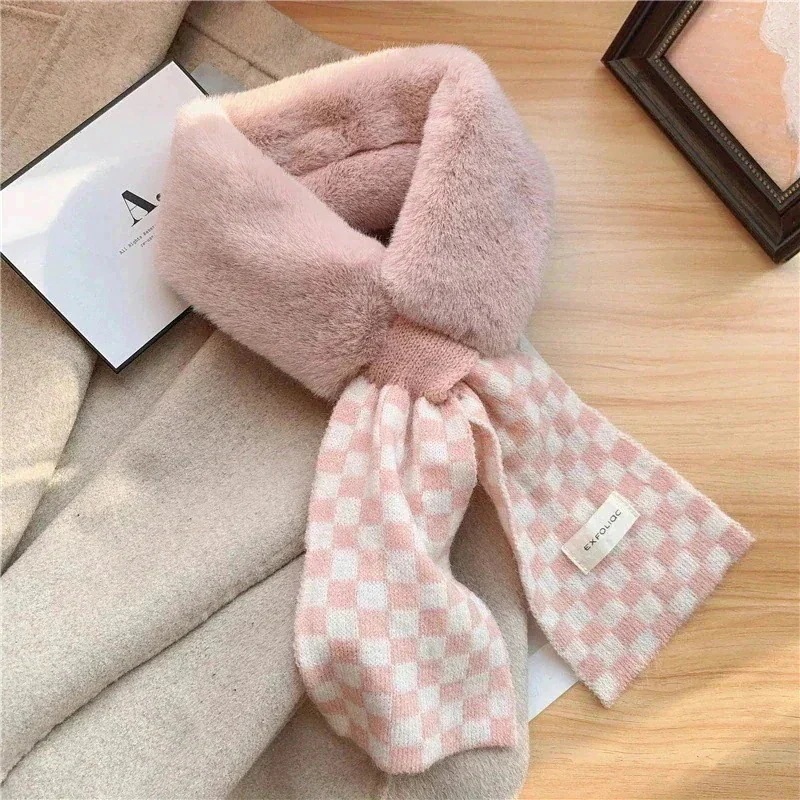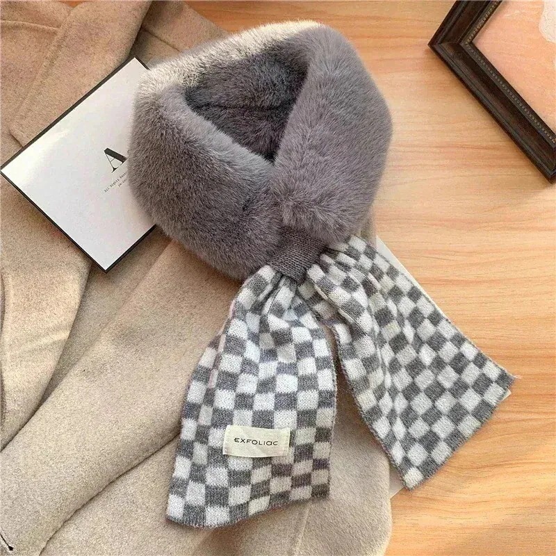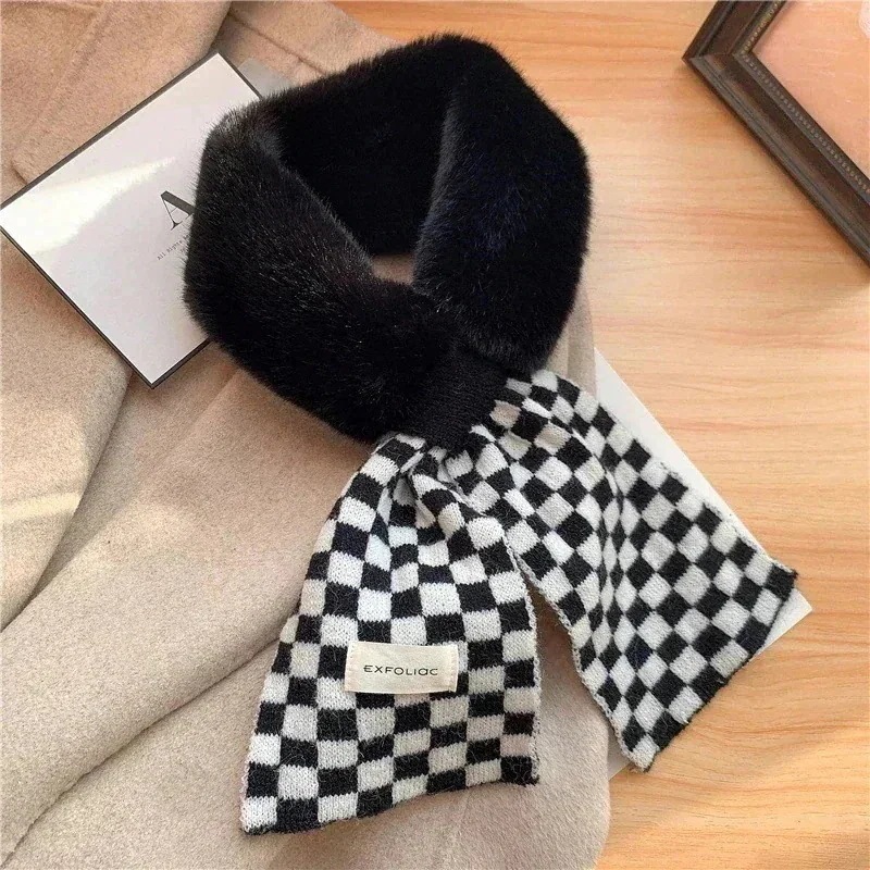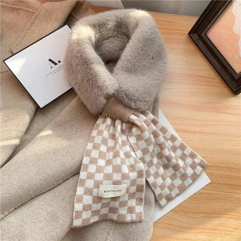 女性デイリーマフラー 冬用 フェイクカシミヤ厚手 棋盤格毛襟デザイン 追加!ぬくぬく暖かい 韓国ファッション風 ウサギ毛交差ネックデザイン可愛い型