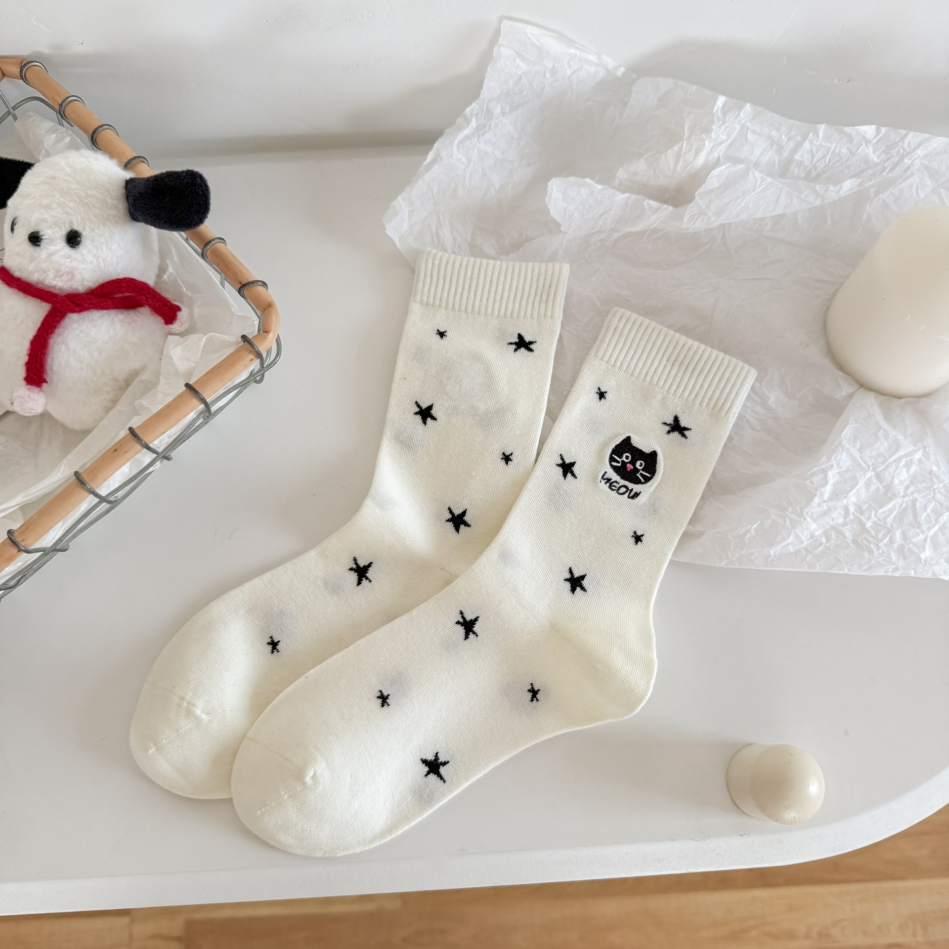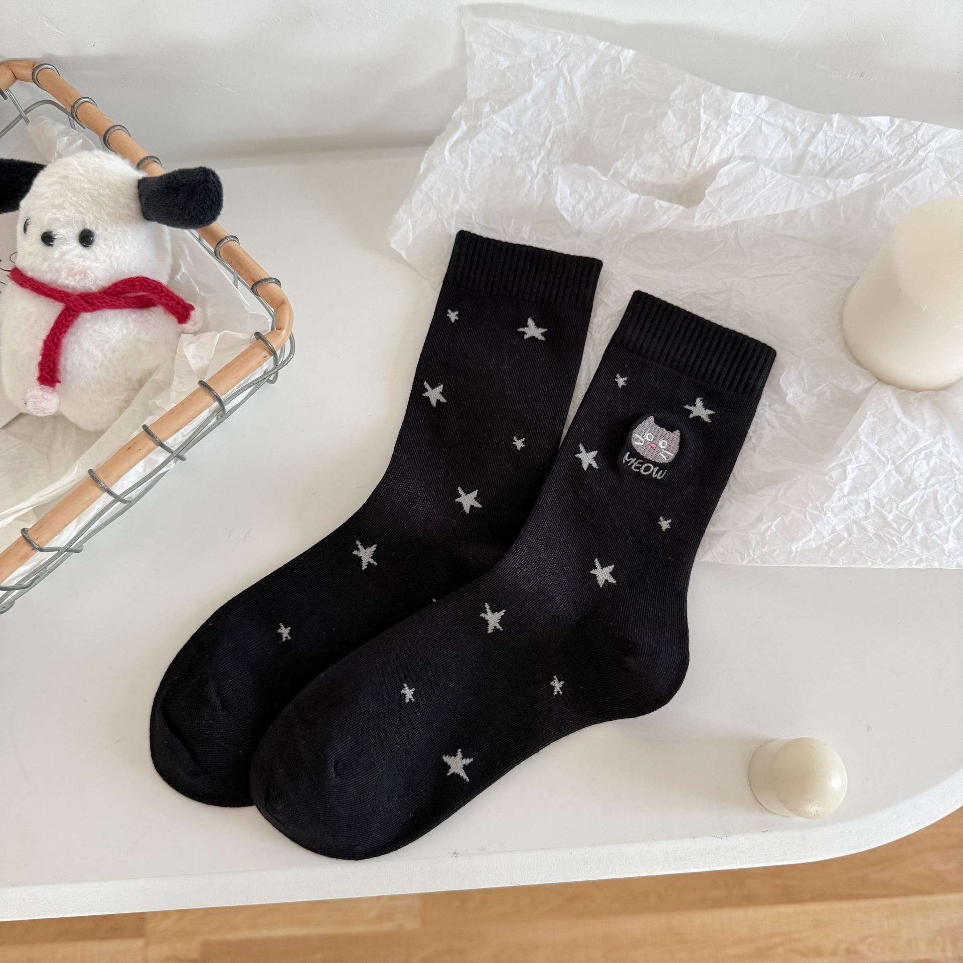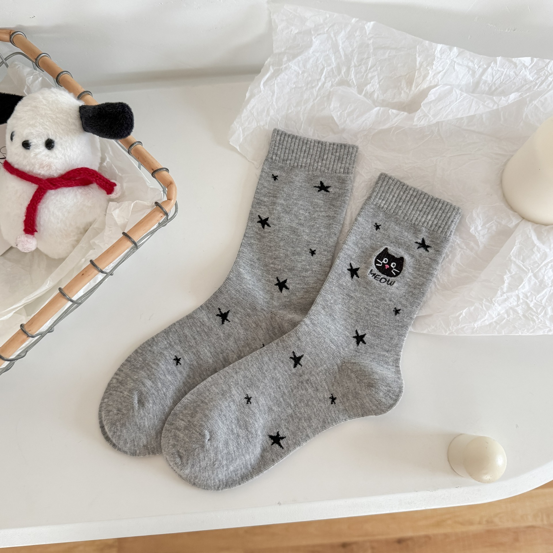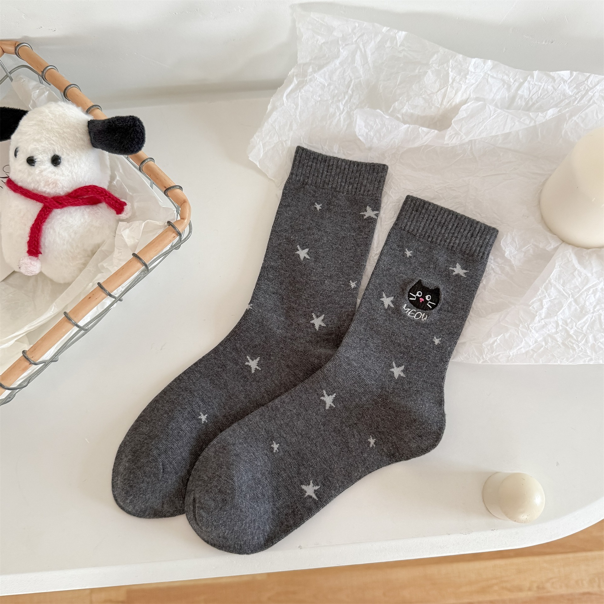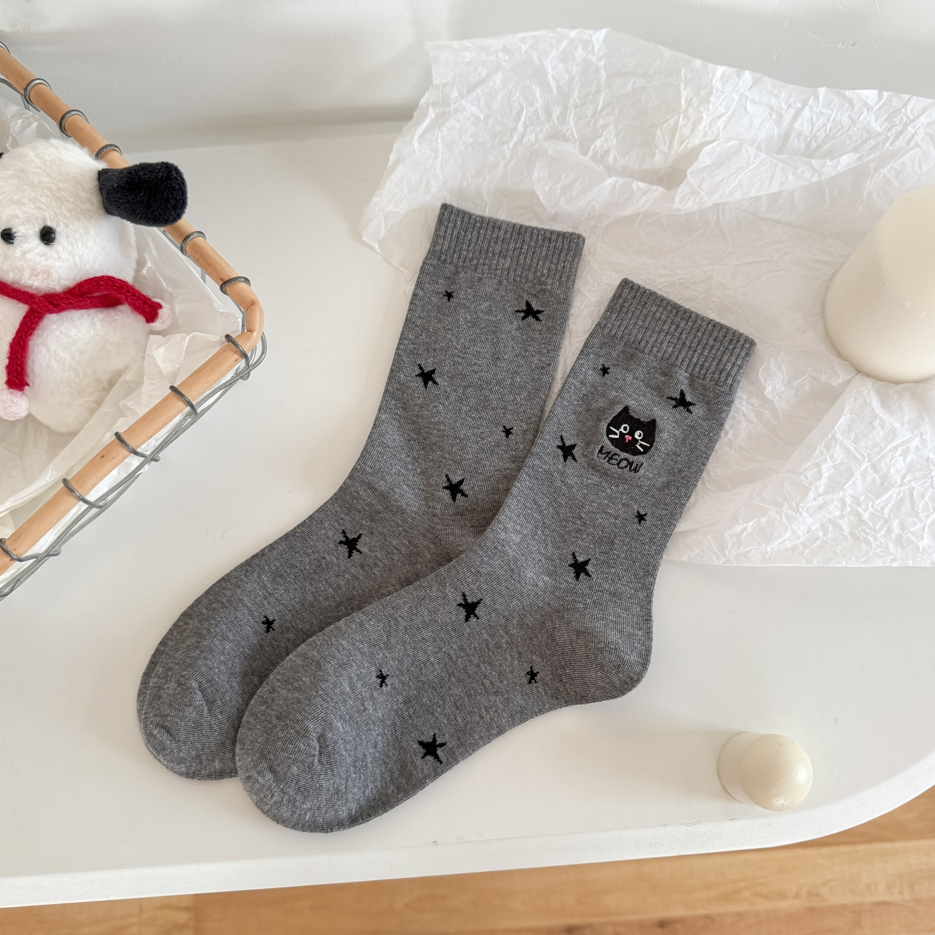 【1点ご購入 で10点プレゼントいたします】秋冬の星にゃんこの刺繍靴下かわいいアニメ綿の女靴下百合グレー系中筒靴下