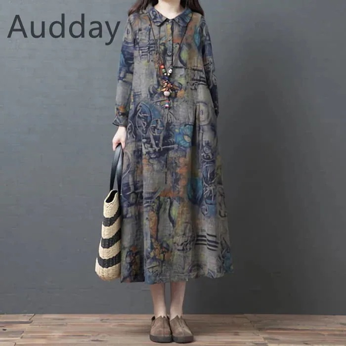 ワンピースレディース405060長袖Auddayプリントシャツワンピースロングおしゃれワンピゆったり大きいサイズ体型カバー