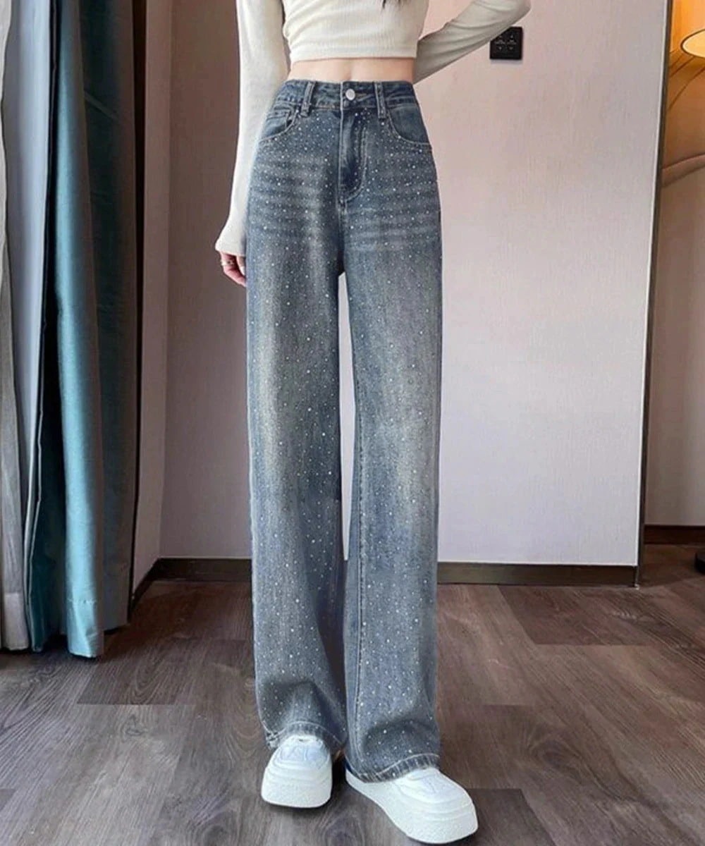 ワイドパンツ キラキラデニムパンツラインストーンデニム29