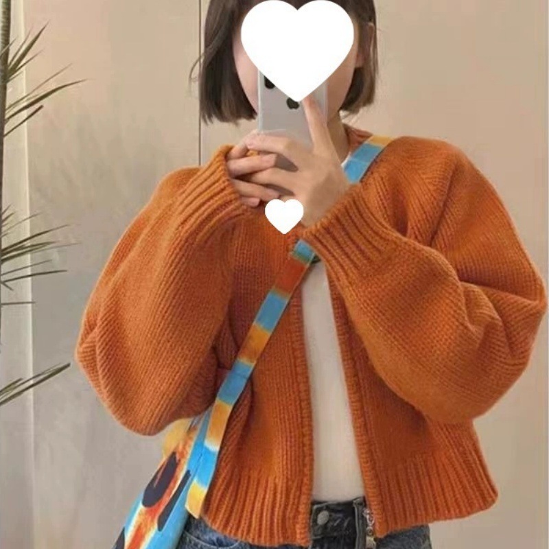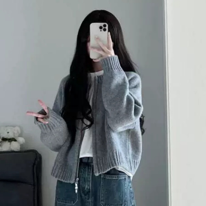 トップス アウター カーディガン ニットセーター レディース 秋冬 長袖 ラウンドネック ニット 厚手 ファスナー ダブルジップ ショート カジュアル 黒 グレー 白
