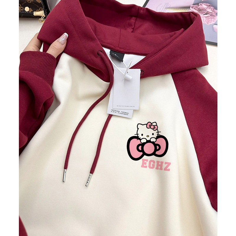 の女性用ホワイトバーガンディラグランコントラストフード付きスウェットシャツ肥厚スプライシングトップ