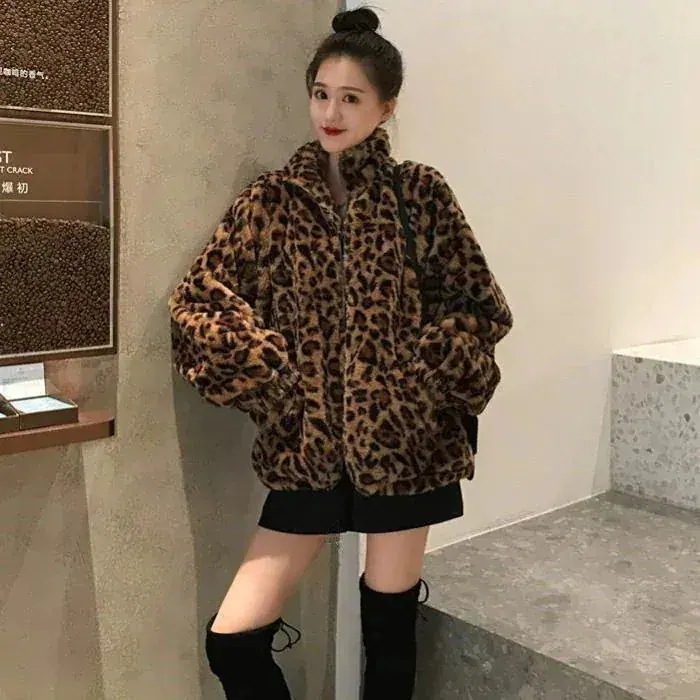 冬アウター 秋冬の新作レオパードプリントスタンドカラーモコモコミディアムコートトップス