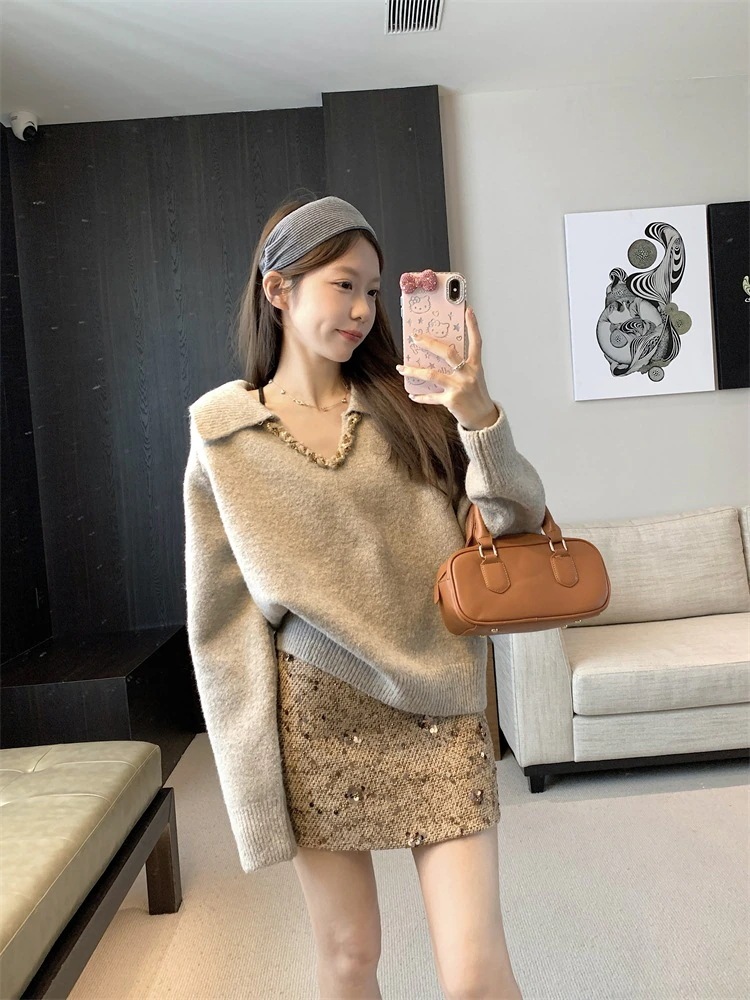 【送料無料】人气新作韓国ファッション 人気なリブニット カシミヤタッチ ニットセーター トップス ニット インナー ベーシックニット Vネックゆったりスウェット リブニット