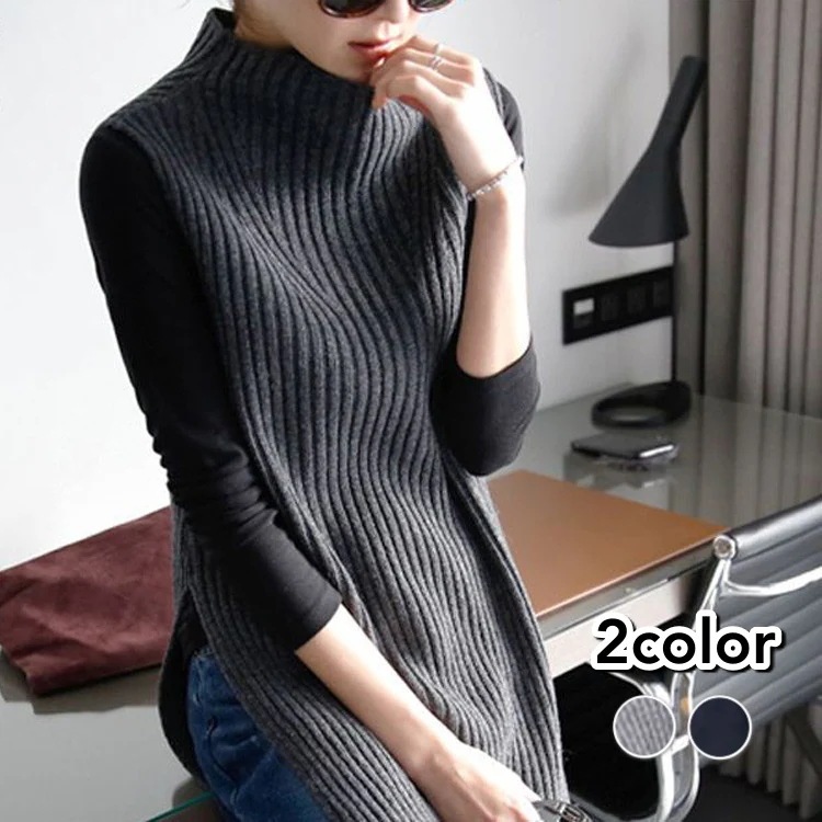国内即発送 ニットワンピース ノースリーブ スリット ワンピース ニットロングベスト ボトルネック マキシ丈 大人可愛い レディース ニットワンピ