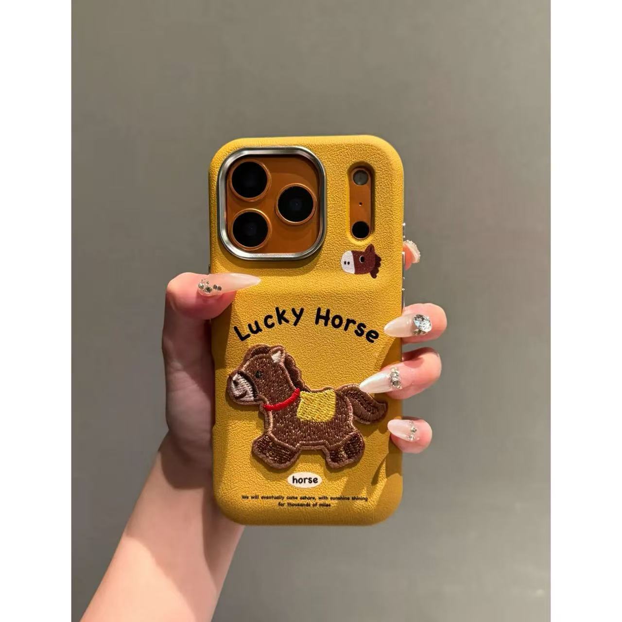 【速達!】姜黄底英文刺繍ポニー14 iPhone 17 promaxアップル16携帯ケース15ドラム13対応
